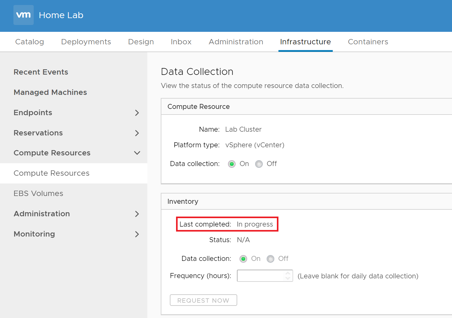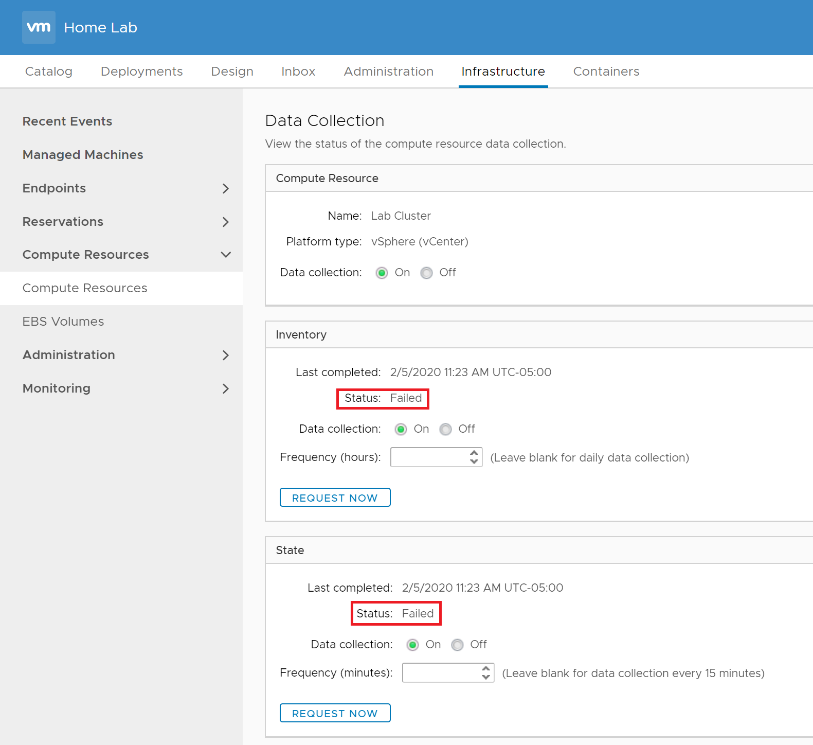After executing the query against your vRA database, go back into the vRealize Automation web interface, and check the Data Collection status for your vSphere cluster Compute Resource. It should now show a status of “Failed” for each data collection task. Additionally, the REQUEST NOW buttons should be enabled and available for you to click again, allowing you to kick off the data collection tasks as you normally would.