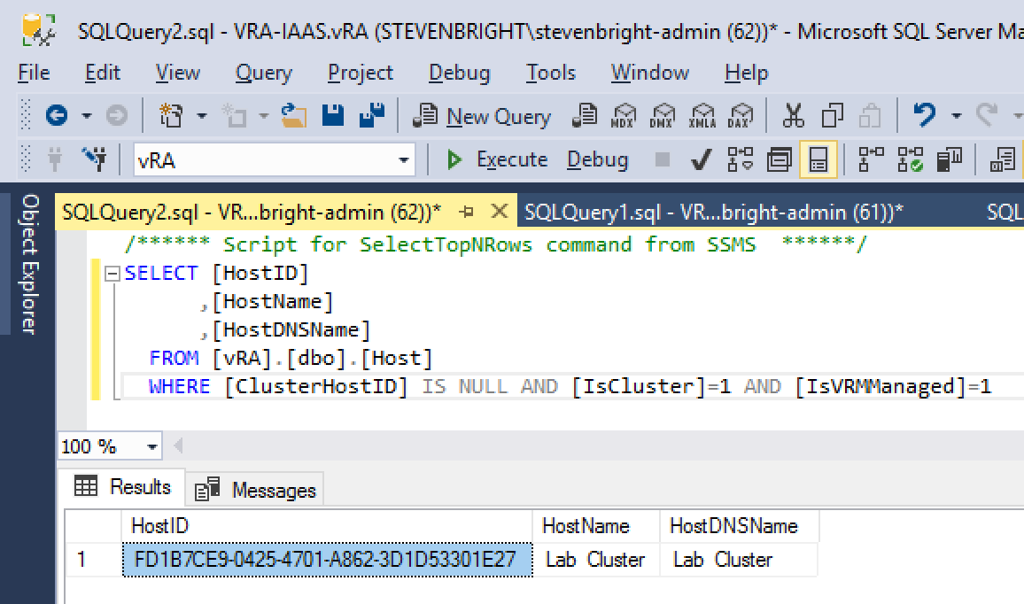 SELECT [HostID] ,[HostName] ,[HostDNSName] FROM [vRA].[dbo].[Host] WHERE [ClusterHostID] IS NULL AND [IsCluster]=1 AND [IsVRMManaged]=1