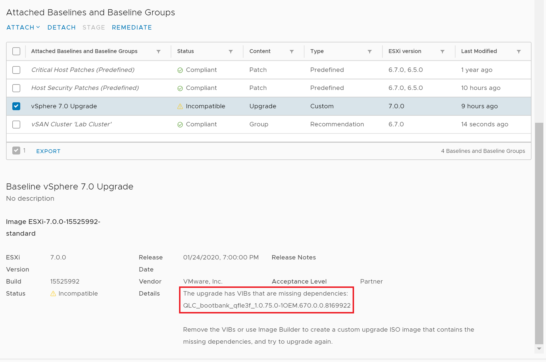 While the error message gives you a pretty good idea of what might be causing the issue, for the life of me, I couldn’t think of what VIBs it could be referring to. As far as I could recall, the hosts had the default ESXi image installed and no third-party software. Luckily, vCenter Lifecycle Manager provided a clue.