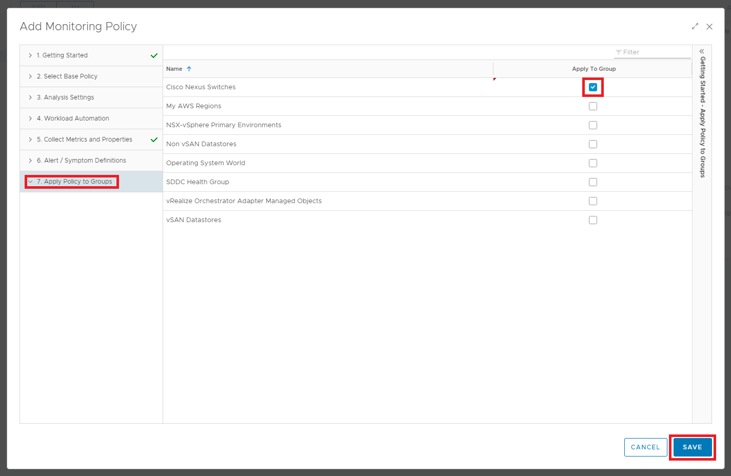 The final section of the wizard that we need to configure is the 7. Apply Policy to Groups section. This screen provides a list of custom group objects that exist within vRealize Operations. Select the “Cisco Nexus Switches” group that we previously created. Selecting our custom group here applies the settings of this policy to our custom group. Finally, click the SAVE button to save our new policy object.