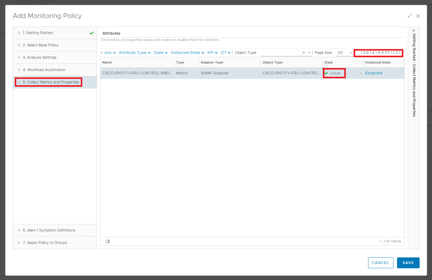 The next section of the wizard that we need to configure is 5. Collect Metrics and Properties. This section of the wizard allows us to define the OIDs that we wish to monitor. The wizard provides several options at the top of the form to filter the Attributes list, but the most straightforward option since we know the OIDs is to search by OID. After finding the attribute for the OID value, update the State field to “Local”. Repeat this step for each OID that we plan to monitor.