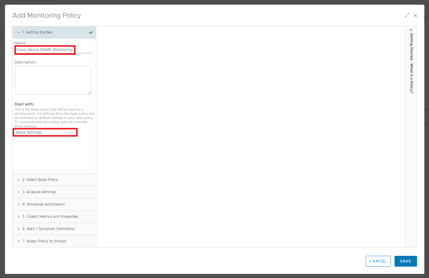 Three sections within the Add Monitoring Policy wizard concern us in this scenario. First, within section 1. Getting Started, we must define a Name, an optional Description for our policy, and the Start with field, which defines the base policy to use as the starting point for this policy. I chose to name the policy “Cisco Nexus SNMP Monitoring”. I chose “Base Settings” as the Start with policy for this new policy.