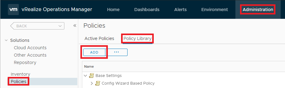 To get started, select Administration from the top navigation menu, then select Policies from the left side navigation menu. The resulting page has two tabs at the top. Select the Policy Library tab and click the Add button to start the process of creating a new policy.