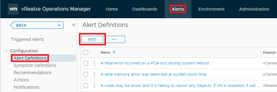 With our symptoms defined based on the data collected via SNMP, we now define our Alert objects within vRealize Operations. To do this, again, select Alerts from the top navigation bar, and then select Alert Definitions from the left side. Click the Add button to begin creating our first Alert object.