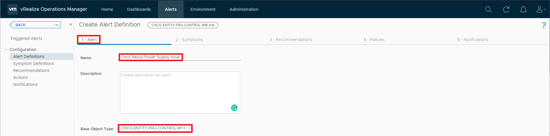The Create Alert Definition wizard is loaded, which contains five sections. For the first section titled 1- Alert, we enter a name for the alert and select the MIB as the Base Object Type. I entered “Cisco Nexus Power Supply Issue”.