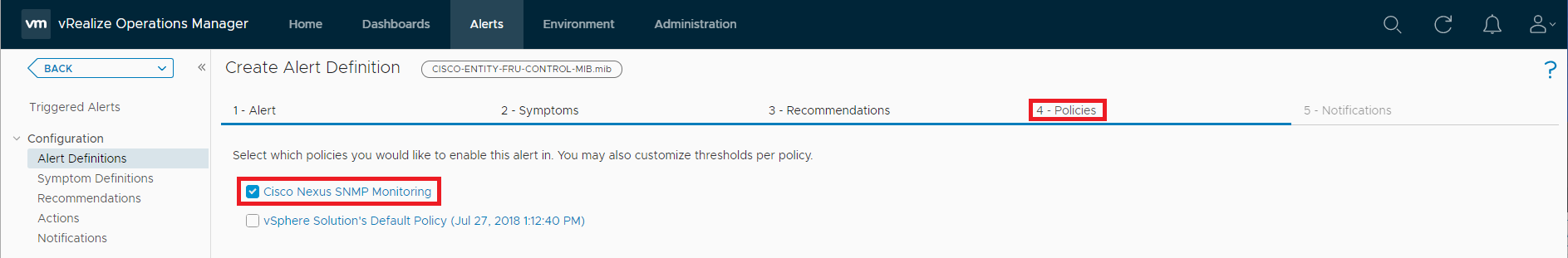Skip the section titled 3 - Recommendations as we did not create any recommendations to be included in our alert. In section 4 - Policies, select the “Cisco Nexus SNMP Monitoring” policy that we previously created to apply these alerts to the devices monitored under the policy.