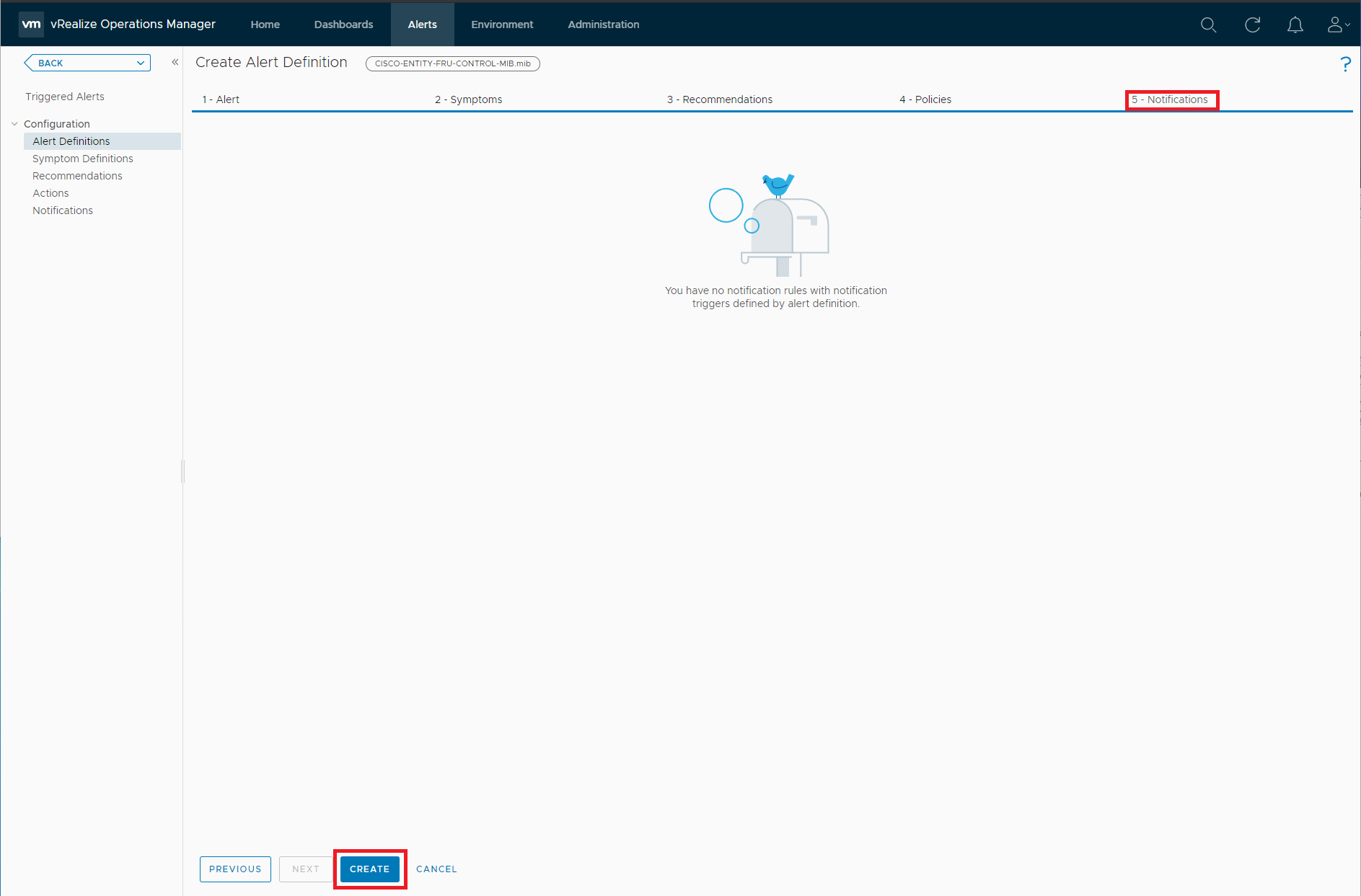 Skip the section titled 5 - Notifications as we do not have any notifications rules defined at this time. Click the Create button to finish the creation of the new Alert object.