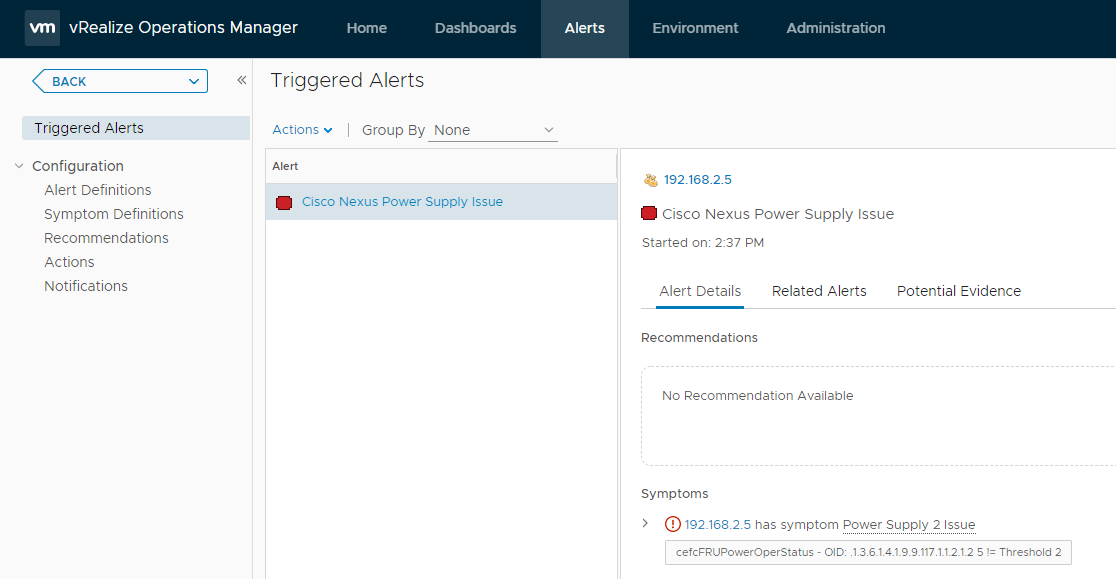 We repeat this process two more times to create alerts for the fan and SNMP encryption symptoms. That’s all there is to it. To verify that the alerts are working (based on the fact that I know one of my power supplies is unplugged), we view our alerts and filter for alerts triggered on “192.168.2.5”. As you see, the alert has been triggered as expected.