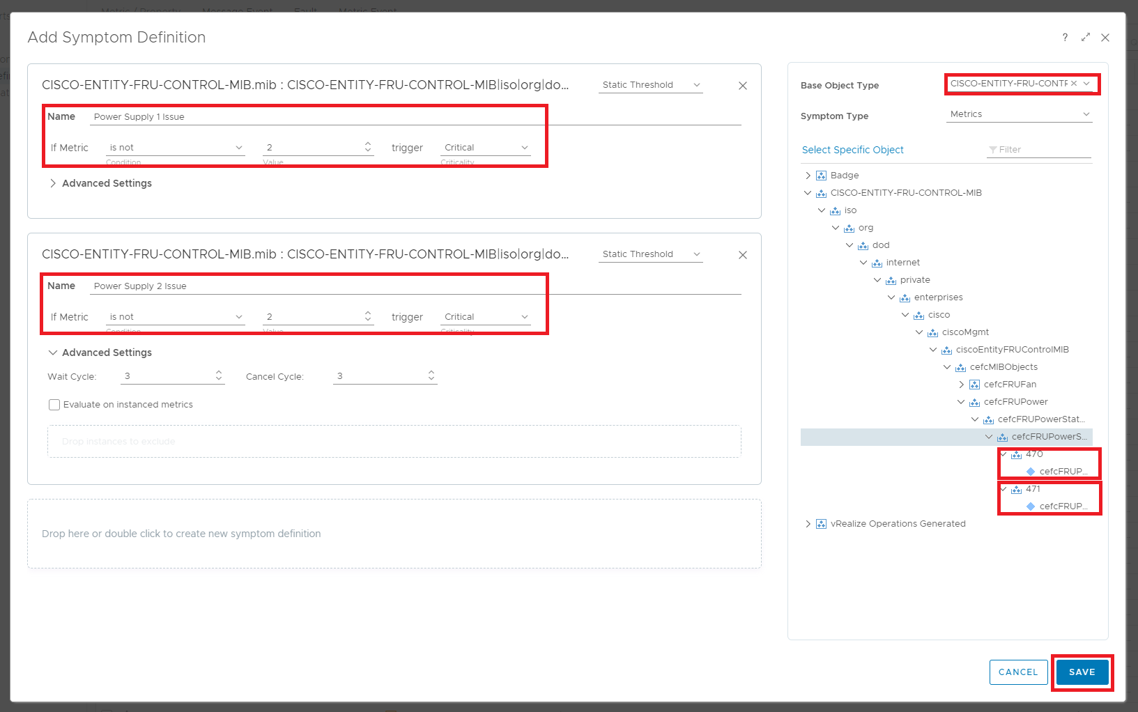On the resulting Add Symptom Definition wizard, we first must select the Base Object Type for our symptom. To create our first symptom regarding the Nexus switch’s power supply, we select “CISCO-ENTITY-FRU-CONTROL-MIB.mib” for the Base Object Type. Next, we expand out the metric tree to find the metric entries for the cefcFRUPowerOperStatus OID. Notice that there are two entries under the cefcFRUPowerOperStatus. Expanding each numeric value provides us the metric to be checked for our symptoms. In the case of the power supplies, anytime a power supply returns a state value other than “2”, we should generate an alert. After we have filled in the proper information, click the Save button to save the symptoms.