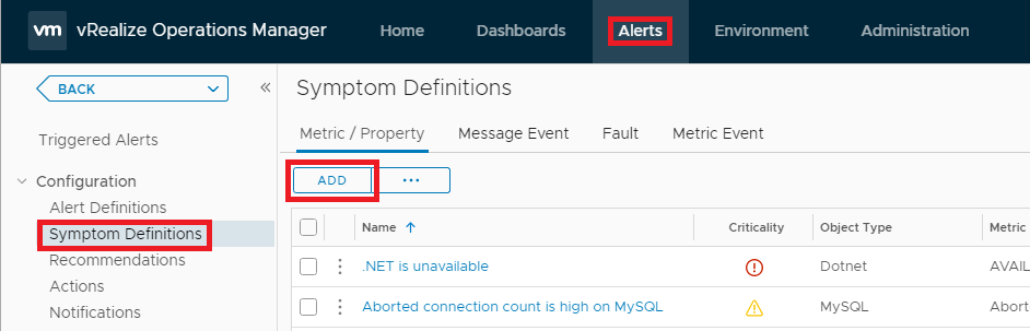 To get started with creating our Symptom definitions, click on Alerts from the top navigation bar. Next, click on Symptom Definitions from the left side, then click the Add button to begin defining the first symptom.