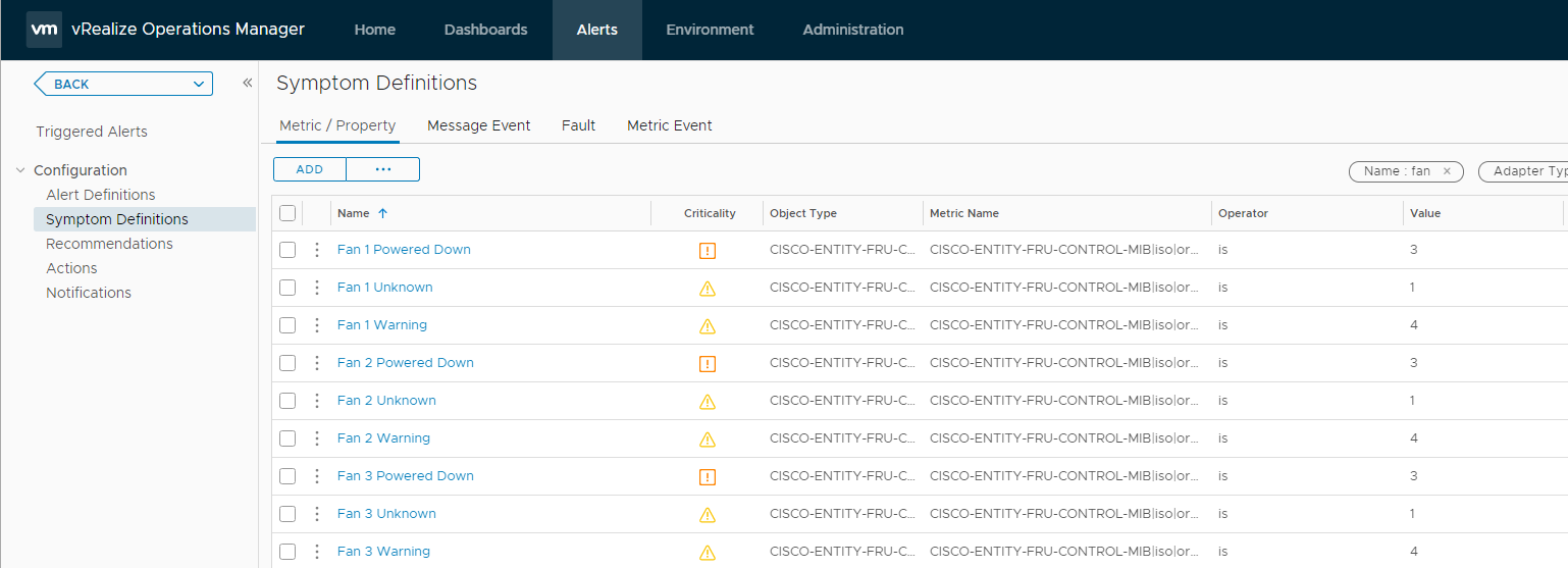 We repeat this process two more times for the cefcFanTrayOperStatus and ccmCommonUsersGlobalEnforcePriv checks. After creating all the symptoms, we should have a list that appears similar to the following.