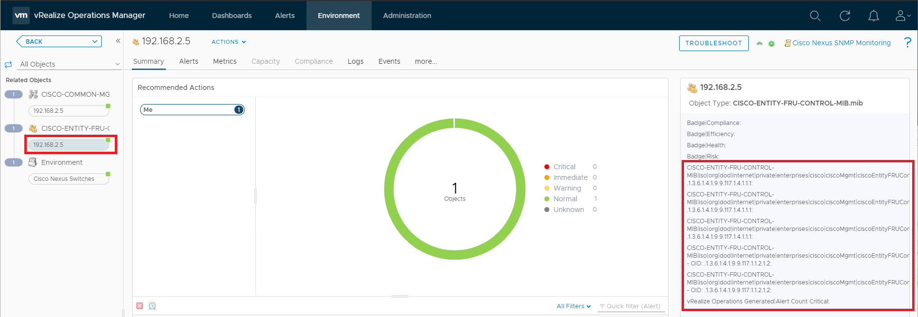 However, I remain confused and disappointed regarding how the plugin implements object creation. In the case of my Cisco Nexus switch, several MIBs apply to the switch. Each time I configure a new MIB to connect and pull information from my switch, vRealize Operations creates a new entity to represent my switch as it relates to the MIB. Each of the new entities created is a distinct entity within vRealize Operations and has no relationship to one another. This prevents me from seeing a holistic view of the data, symptoms, and alerts that apply to the physical switch. I hope that a future release of the vRealize Operations Management Pack of SNMP addresses this issue and allows for the consolidation of all SNMP data related to a single device to be visible under one entity in vRealize Operations.