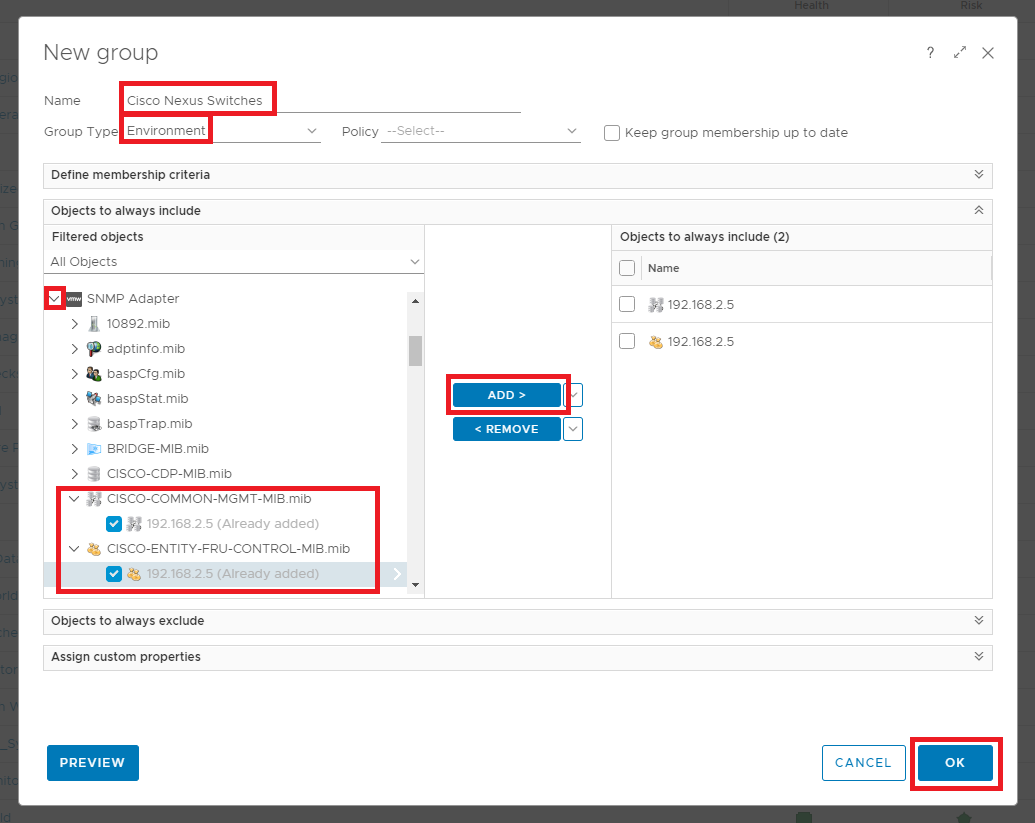 In the Name field, provide a descriptive name. In my case, I use “Cisco Nexus Switches”. Next, for the Group Type field, we select “Environment”. If you wish to use something else, you can follow the documentation link I provided above to define custom Group Types. Since we are not using dynamic criteria to populate our Custom Group, you can ignore the Keep group membership up to date checkbox. Next, we expand the section “Objects to always include”, expand the SNMP Adapter, then expand the entries for each of my MIBs. The IP address for the device is listed under each MIB. We place a checkmark next to both entires and click the Add button to include them in the group. Next, click OK to save the group.
