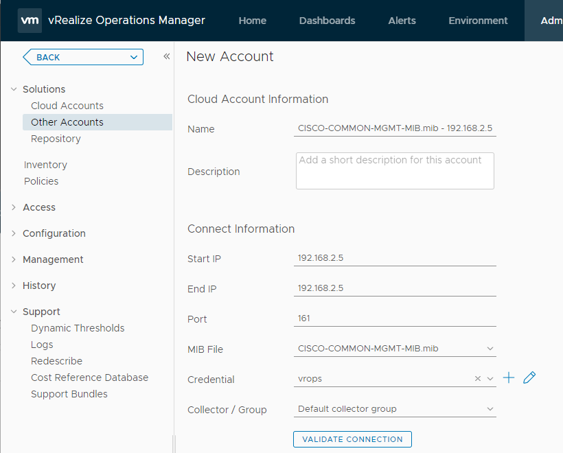 Next, we select the MIB file to use when collecting information from our device. In this walkthrough, we select CISCO-ENTITY-FRU-CONTROL-MIB.mib from the list. Since this is our first time configuring the SNMP Adapter, we need to create a new SNMP credential for the Credential field. Click on the + sign to the right of the field. On the resulting Manage Credential dialog, depending on the version of SNMP you are using to connect to your device, select either SNMPv2c Credential or SNMPv3 Credential and provide the required details for you SNMP connection credential. After you’ve created your credential, make sure that it is selected in the Credential field. Click the Validate Connection button to validate that vRealize Operations can successfully communicate with your device using the SNMP configuration that you provided. If the validation test is successful, click the Add button to save the configuration.