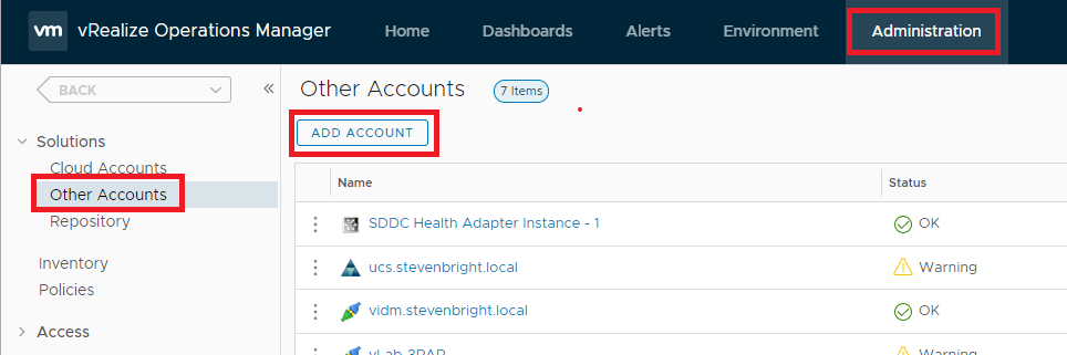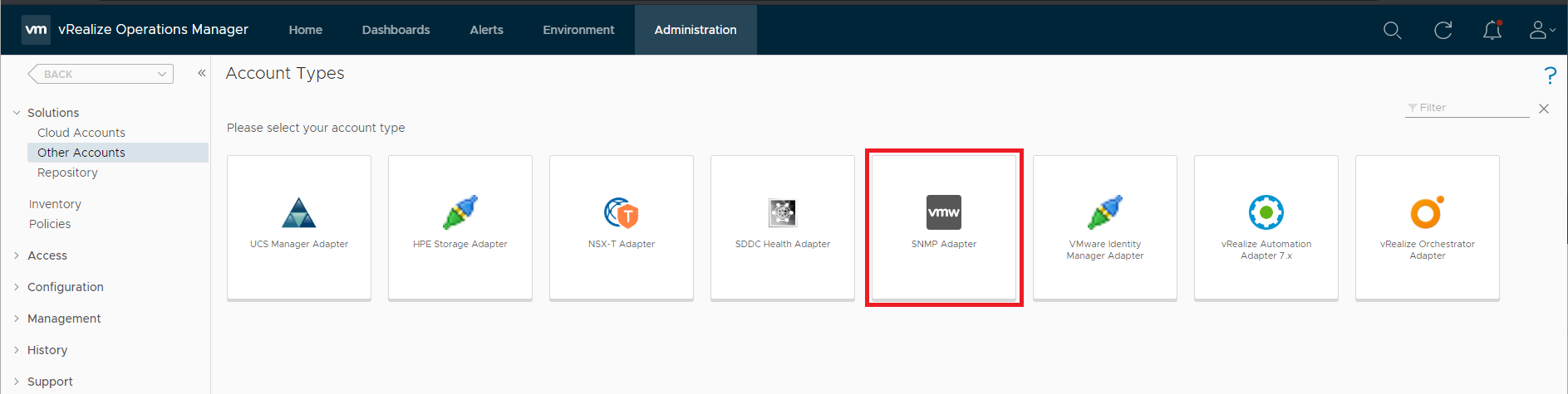 To get started, in vRealize Operations, select Administration from the top navigation menu, then select Other Accounts from the left side navigation menu. From the Accounts Type screen, select SNMP Adapter.