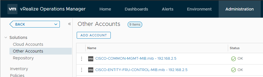 Now you might say: “Wait a second, didn’t you say you’d be monitoring the device using two MIBs?” You are correct. That’s why we must repeat this process a second time, but when entering the information, we select the CISCO-COMMON-MGMT-MIB.mib for the MIB File field. When finished, vRealize Operations lists two SNMP Adapter configurations for our device.