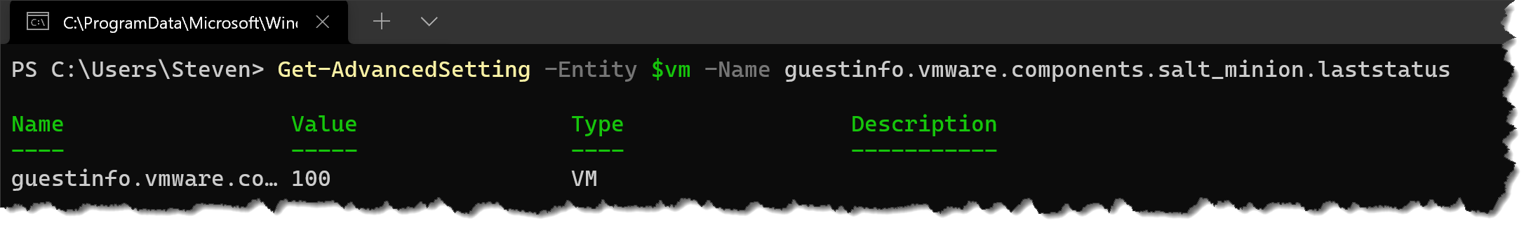 Get-AdvancedSetting -Entity $vm -Name guestinfo.vmware.components.salt_minion.laststatusThe cmdlet should return the advanced setting with an expected value of “100”. The following are the possible return values: