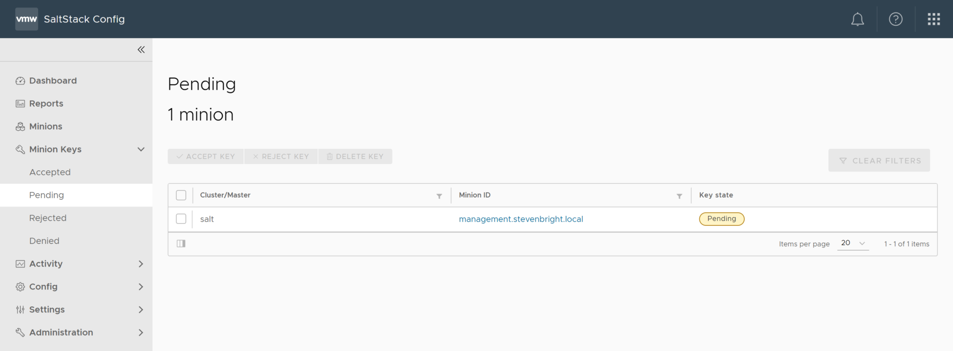 Assuming everything has worked as expected, you should also now see a new Minion Key pending approval within the VMware vRealize Automation SaltStack Config web UI.