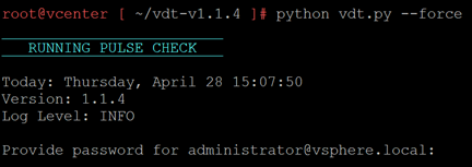 When you execute the fling’s script, it will first request your administrator@vsphere.local credential. While many of the checks can be performed without the credentials, you will need to provide the password to complete the full list of checks. Next, you will see it working its way through the various checks. If you find some checks timeout before completing execution, rerun the script with --force appended to the command.