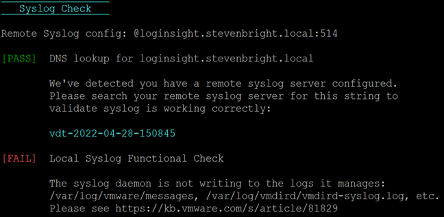 As the scripts execute, you’ll see a color-coded output indicating each check’s Pass/Warning/Fail status. The screenshot below shows that the Local Syslog Functional Check has failed. The script has also referenced a VMware KB that may help resolve the issue.