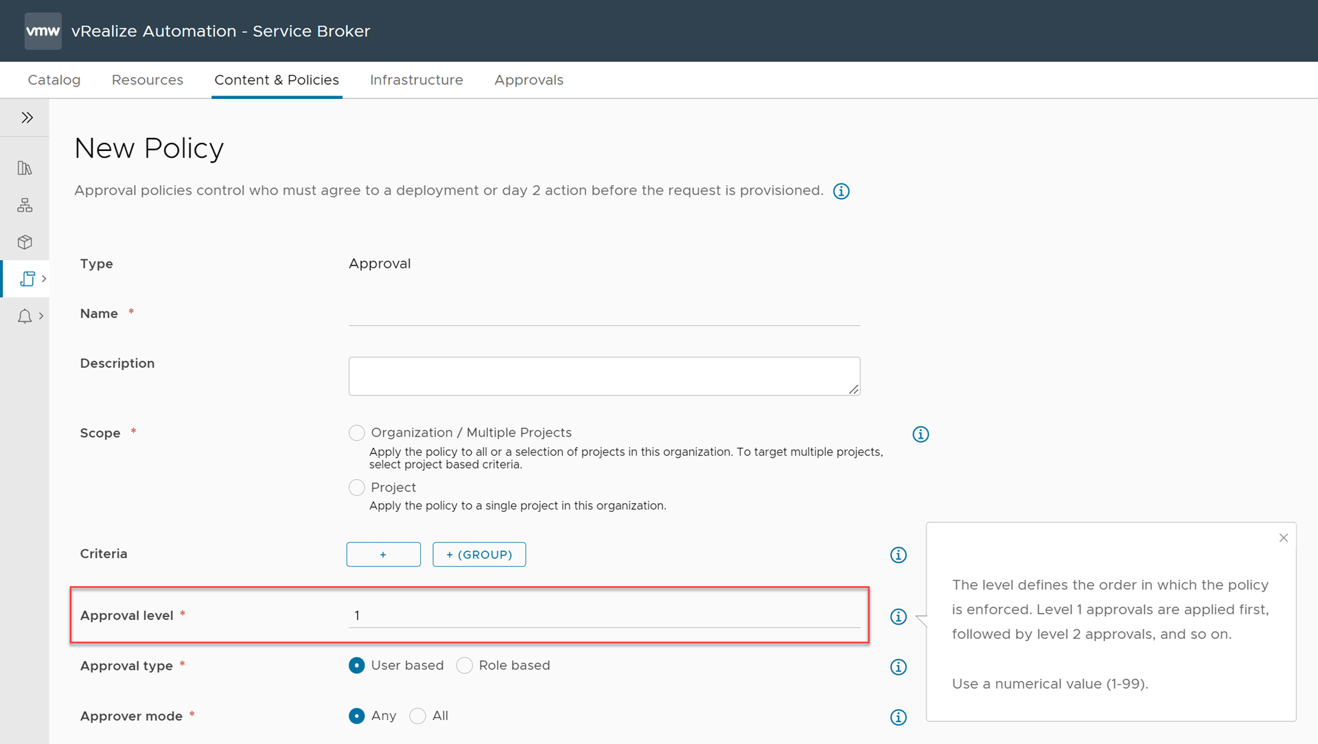 Multi-Level Approval Policies – Similar to vRealize Automation 7.x, you can now define approval policies that require multiple levels of approval. This change includes a completely revamped user interface for defining approval policies and API changes. See the VMware documentation titled Configure multi-level approval policies in Service Broker for details.