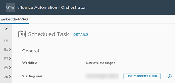 Update the Authentication Settings for Scheduled Tasks - A new field called Starting user is available when editing a scheduled task. You can use this field to change the user who is authenticated to run the scheduled task. This feature is only available while editing an existing scheduled task you have created previously. See the VMware documentation titled Edit Scheduled Task in the vRealize Orchestrator Client for details.