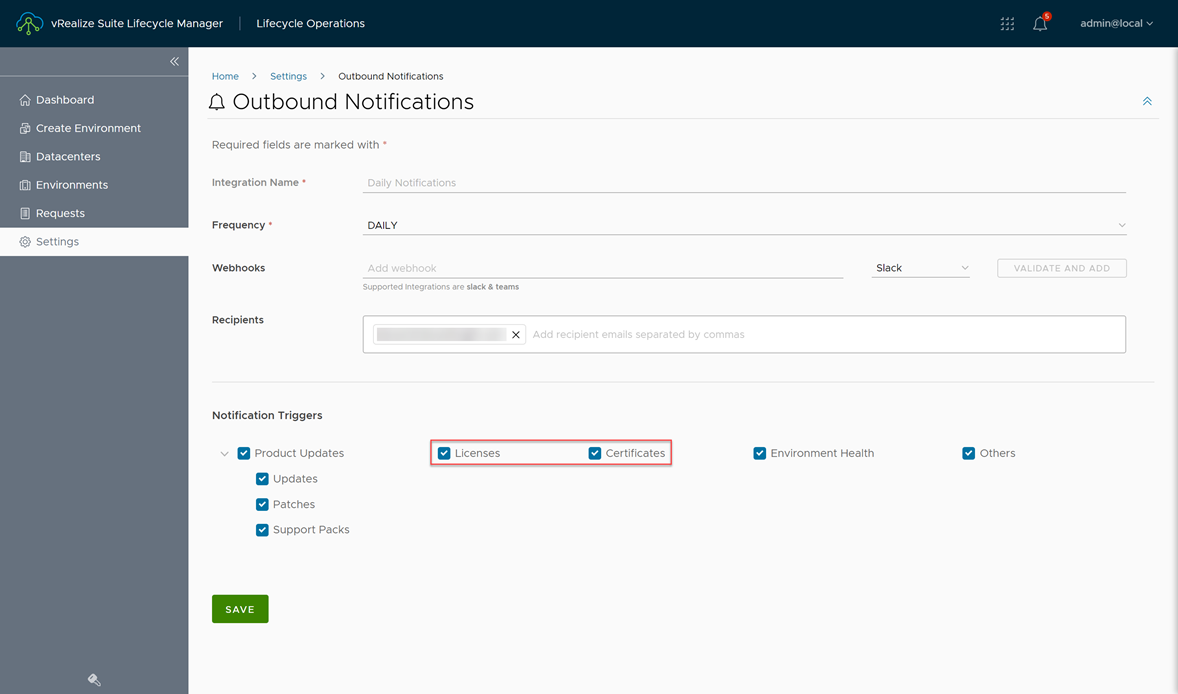 Additional Notifications - vRealize Suite Lifecycle Manager will now provide notifications for certificates and licenses that have expired or will soon expire.