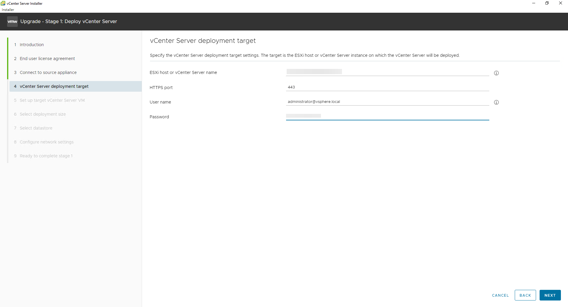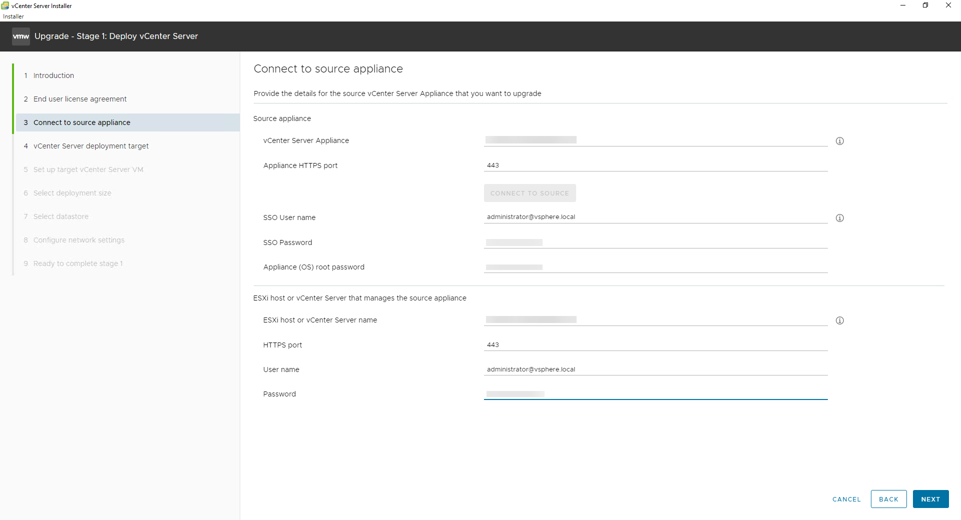 After clicking NEXT, the installer will ask for all the details regarding the source VMware vCenter Server instance. These details include the FQDN, SSO administrator account, root account password, the FQDN of the vCenter Server/ESXi host that manages the appliance, and the login credentials for the managing vCenter Server/ESXi host.