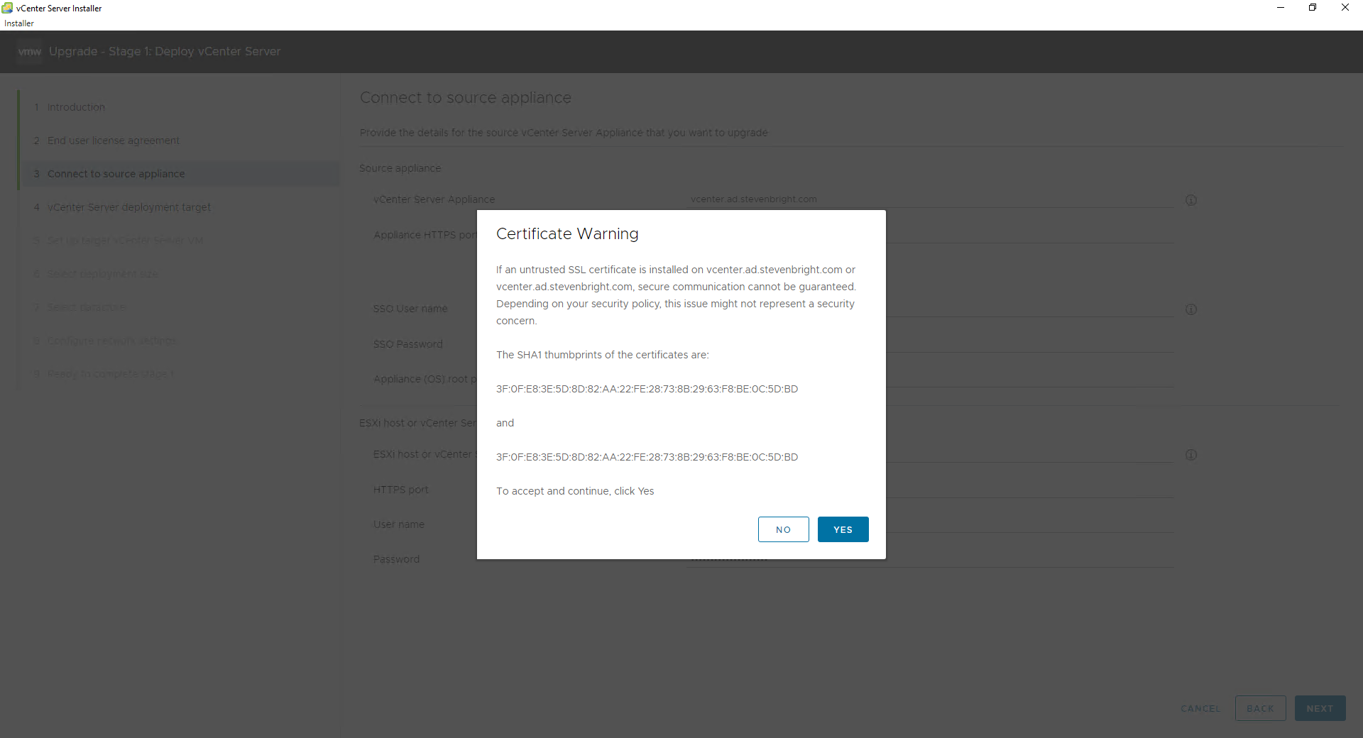 After you click NEXT, the installer will request that you confirm the thumbprint of the source vCenter Server instance and the vCenter Server/ESXi host managing the appliance.