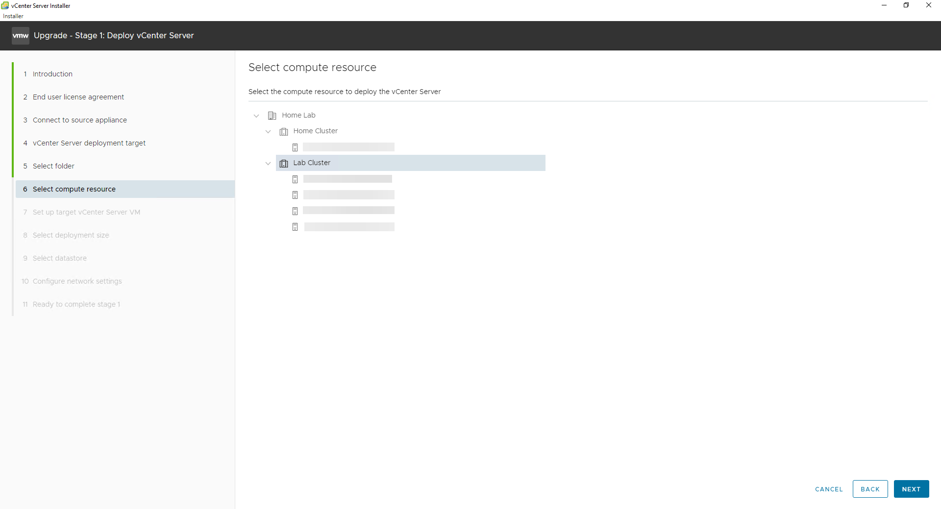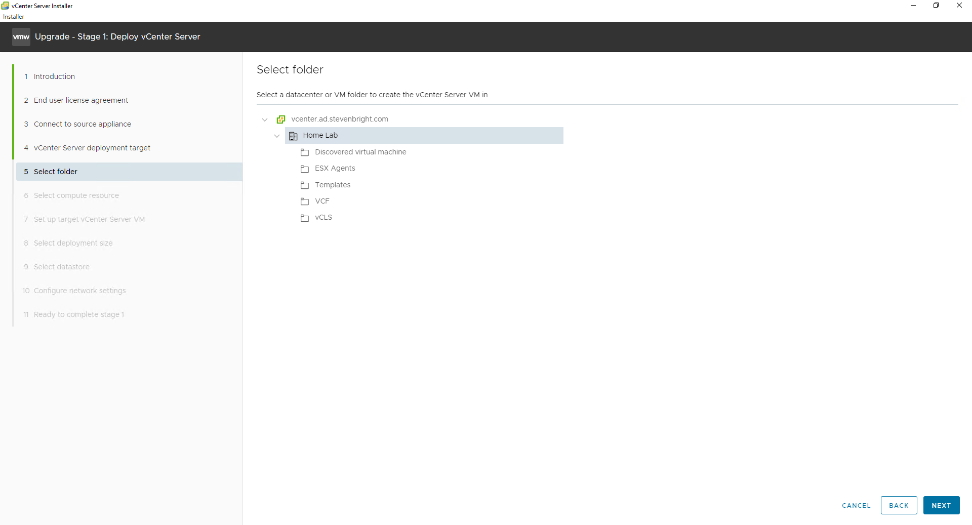 After clicking NEXT, you are again prompted to confirm the thumbprint for the target vCenter Server/ESXi host’s certificate. After confirming the certificate’s thumbprint, you will select the target vCenter Server’s folder and compute resource where the new appliance will be deployed.