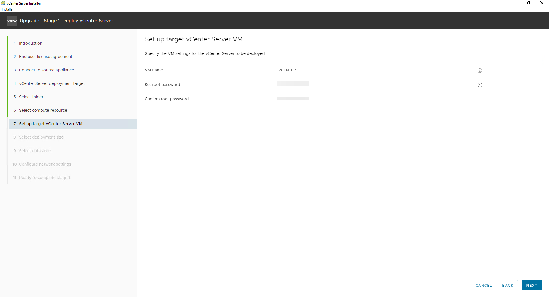 Next up is the new VM’s name and root password. In my case, I want the VMware vCenter Server 8.0 appliance to have the same name as my 7.0 appliance. For this to happen, you will first need to rename your 7.0 virtual appliance to a different name; otherwise, the installer will complain that the name is already in use by another VM.