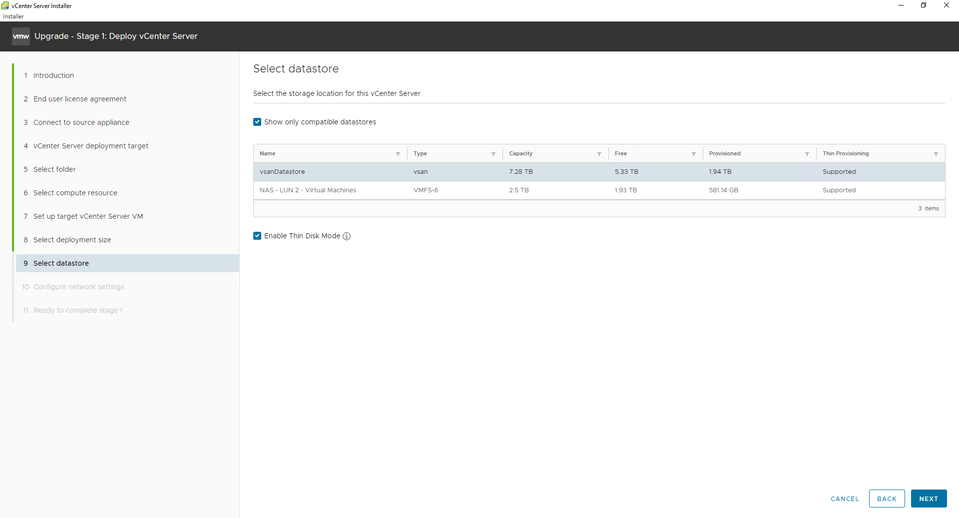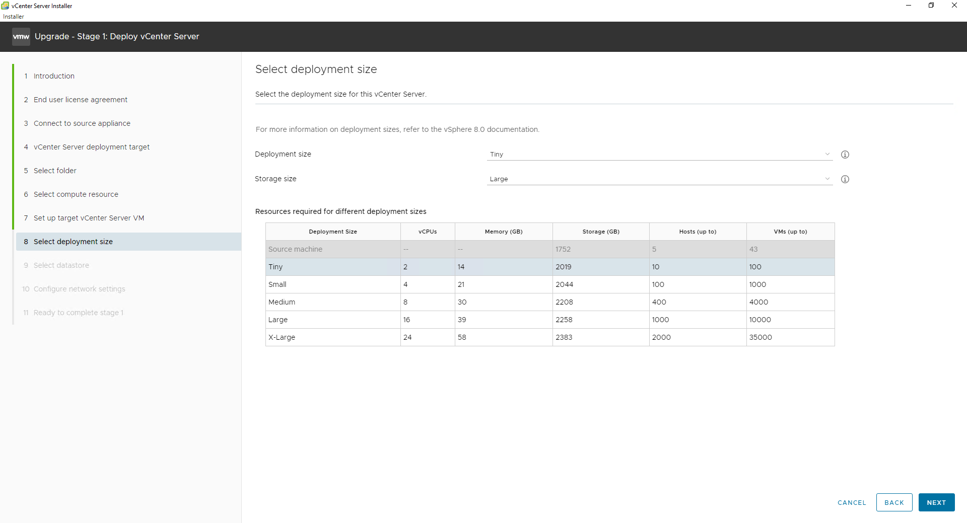 The installer will now request that you specify the deployment size. The installer will default select the smallest deployment size that matches your current configuration. This selection will consider the existing CPU, RAM, and storage allocations. This step is also a great time to ensure that your vCenter Server deployment size matches your current or planned environment.