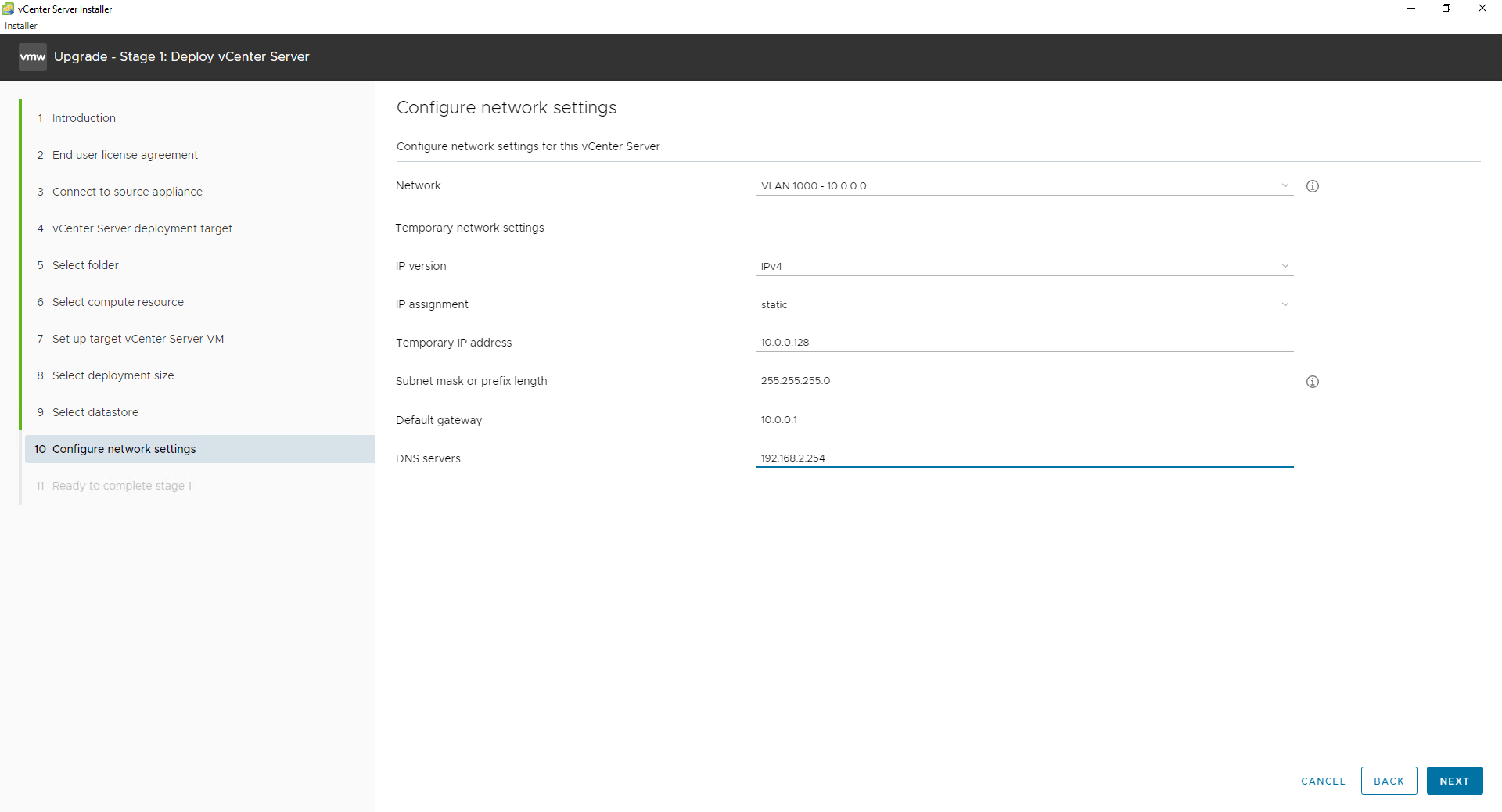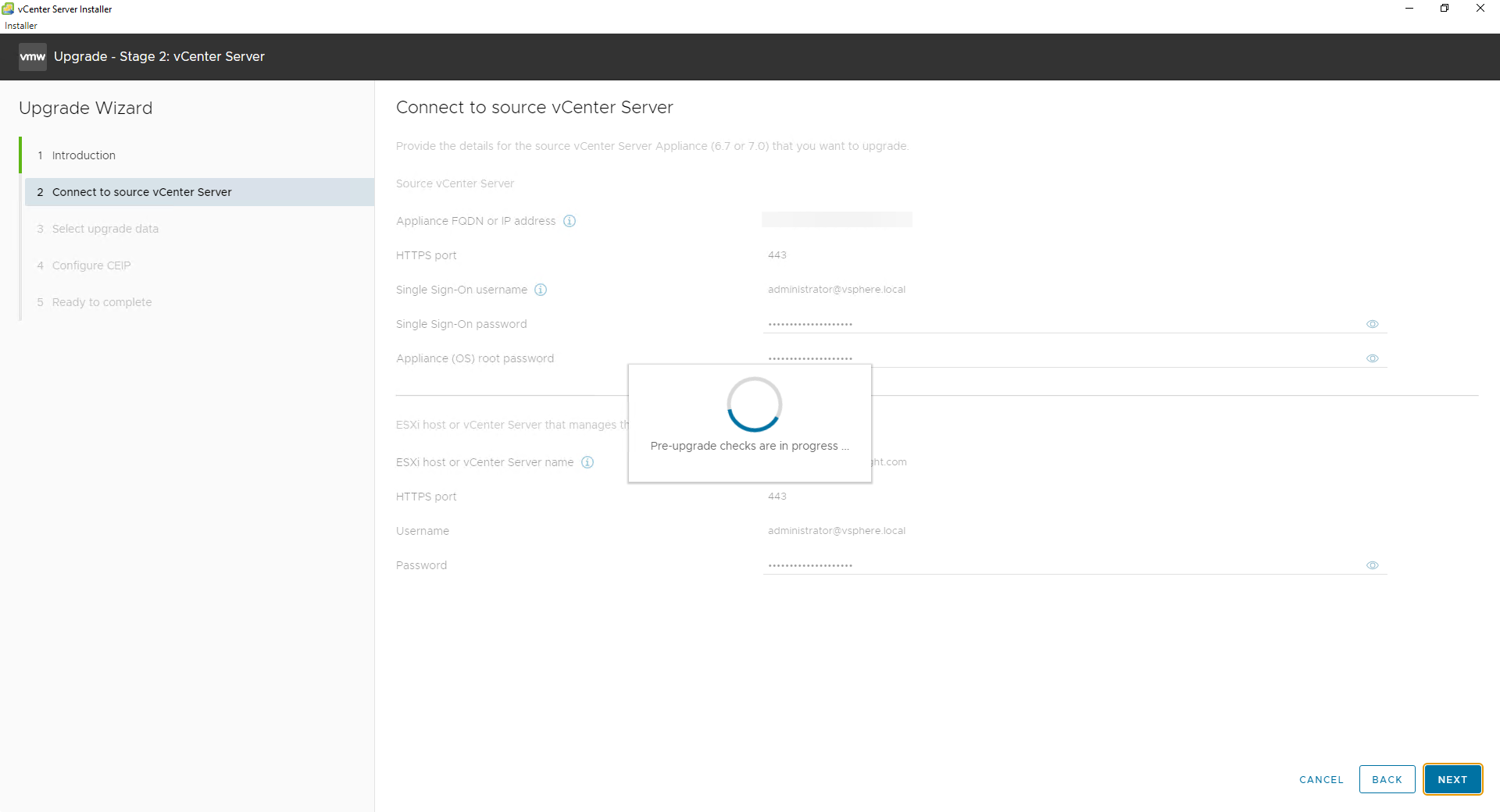 After clicking NEXT, the wizard will confirm that it can access the source vCenter Server appliance using the connection details provided during Stage 1 of the upgrade process.