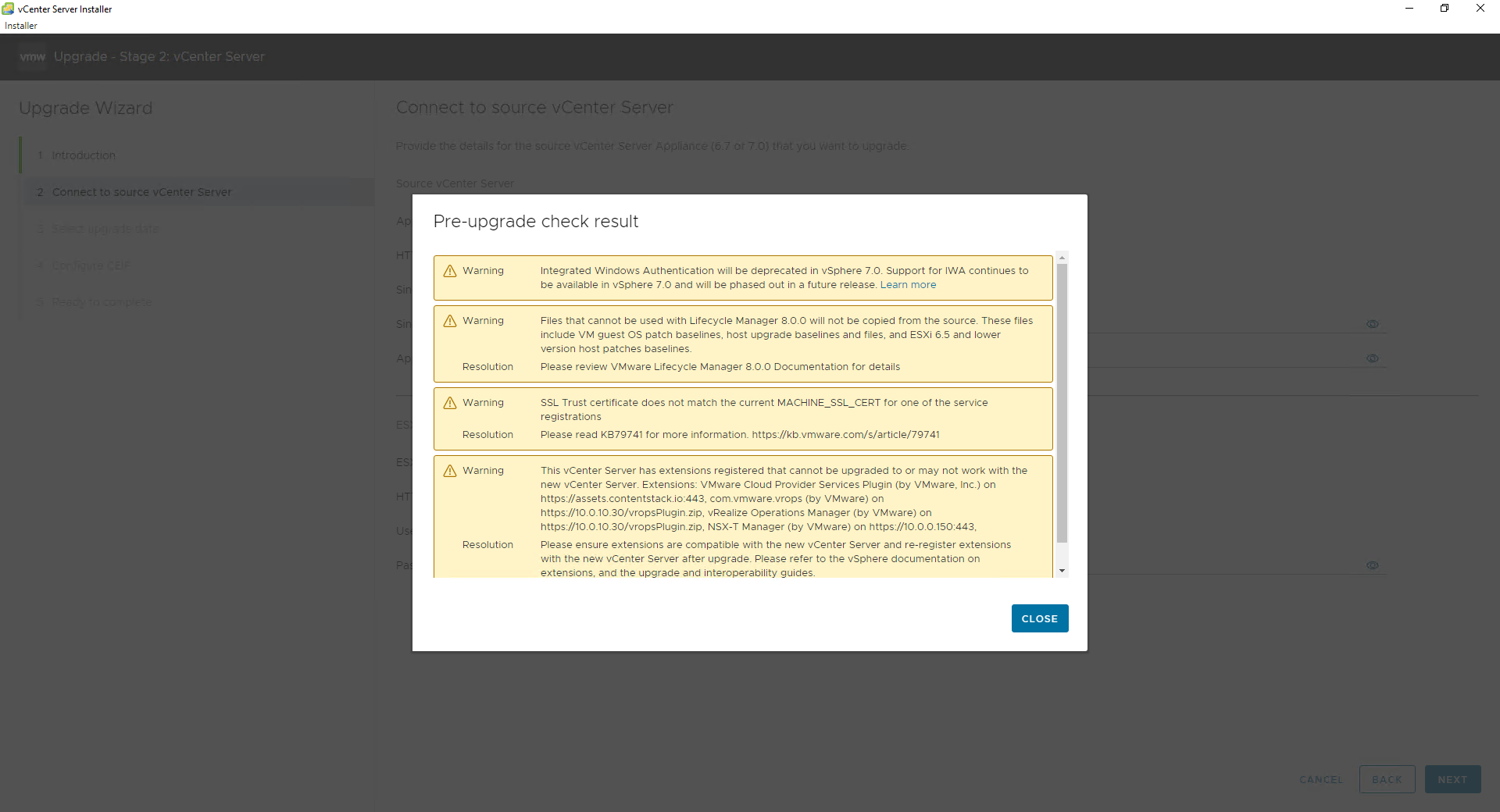 Next up, the installer will check the source vCenter Server and notify you of any warnings or issues regarding the upgrade to VMware vCenter Server 8.0. These warnings could include deprecated features, data that the installer will not migrate, certificate-related issues, or unsupported plugins.
