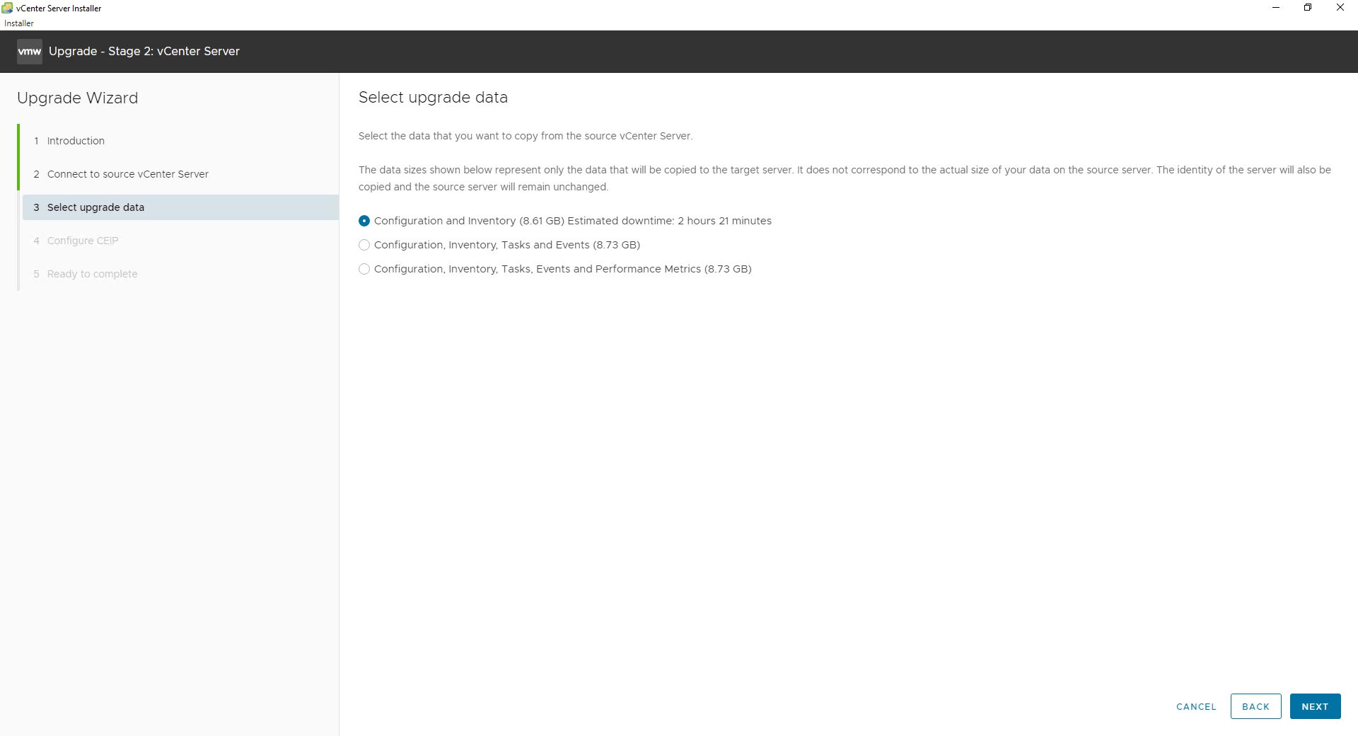After reviewing the Pre-upgrade check results, your next task is to specify which data the upgrade process will migrate from the source VMware vCenter Server instance.