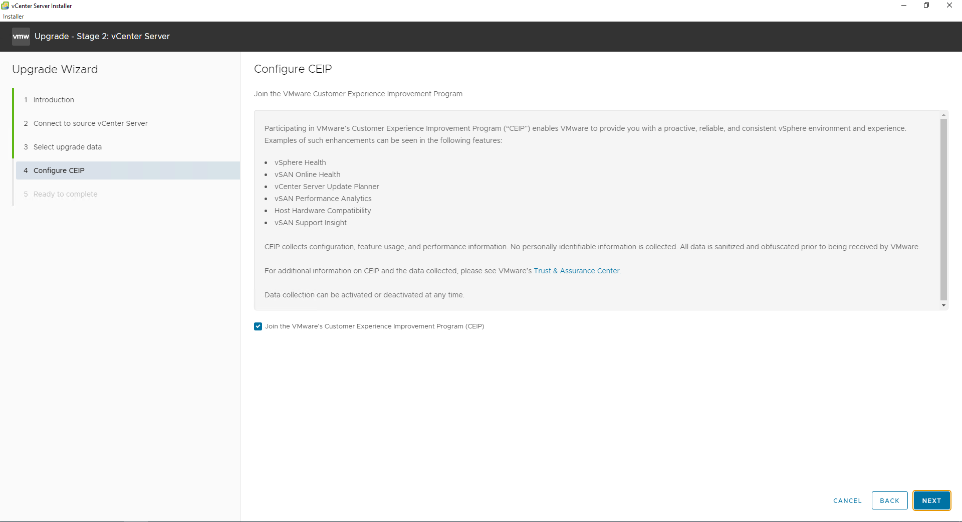 Specify if you wish to join the VMware Customer Experience Improvement Program (CEIP).