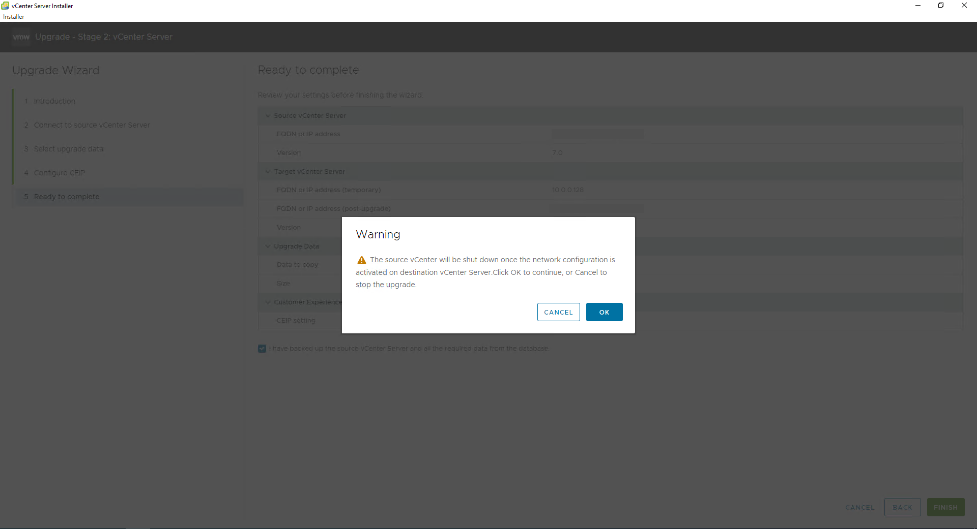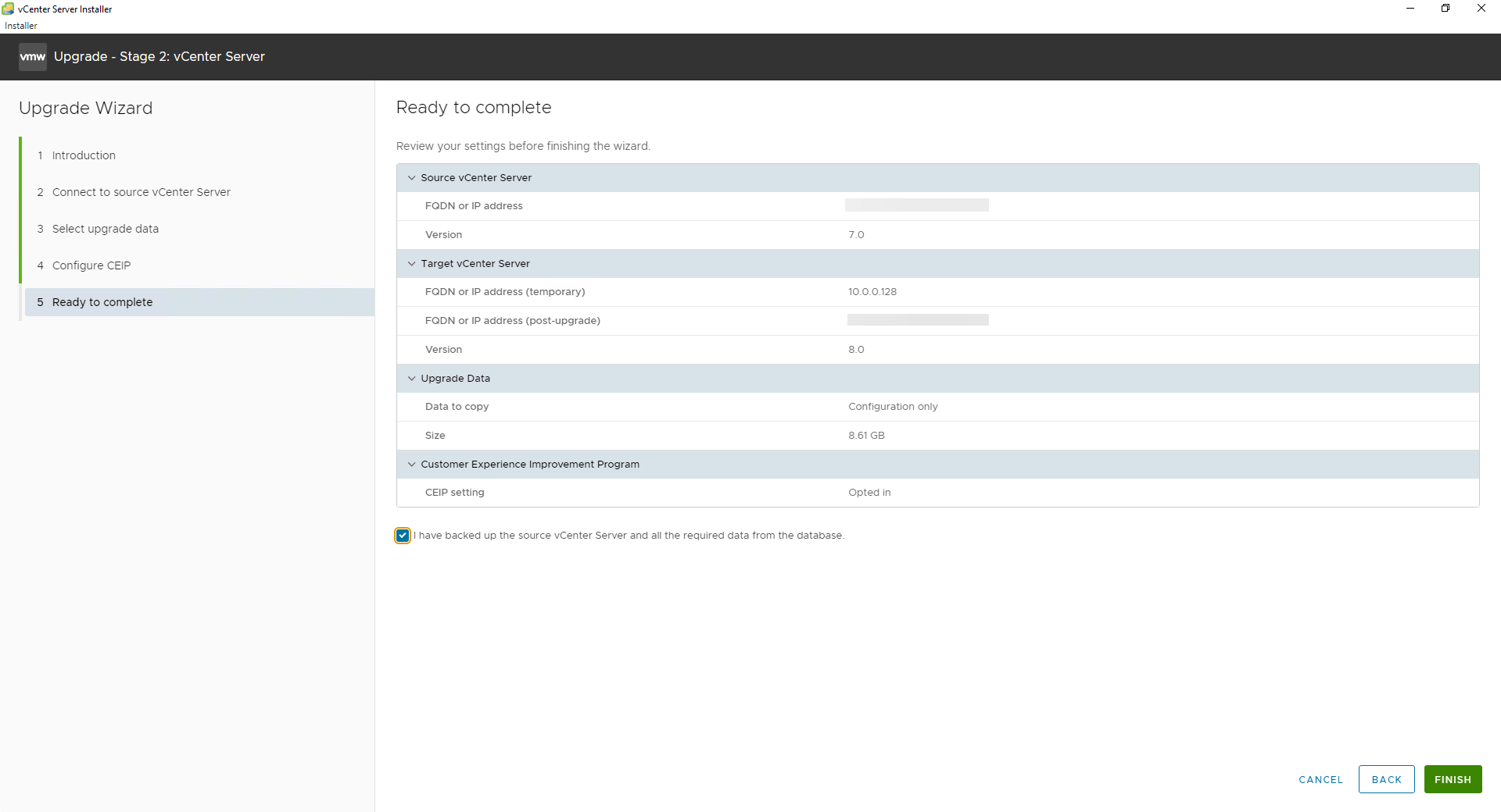Finally, review the details you provided before executing Stage 2 of the process. If the data is correct, confirm that you have a backup of the source vCenter Server appliance and click FINISH to complete the remainder of the upgrade process.