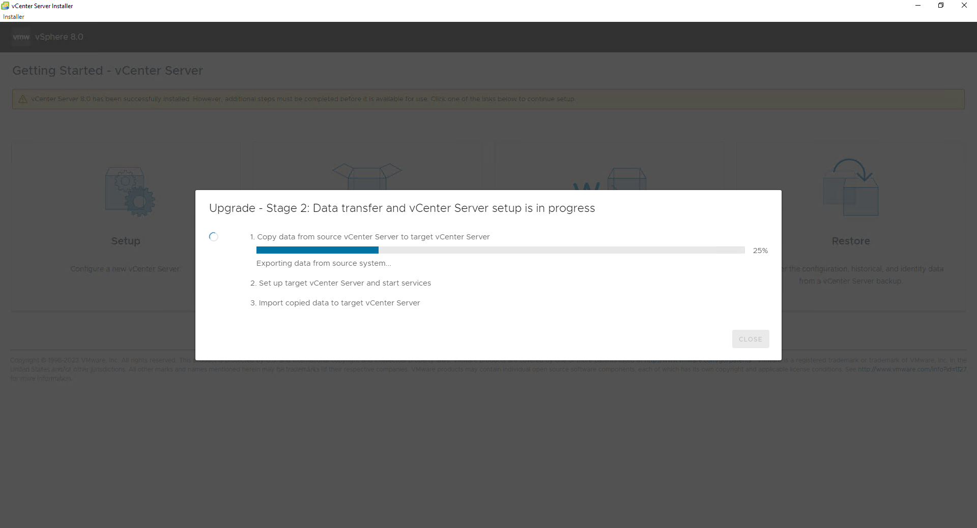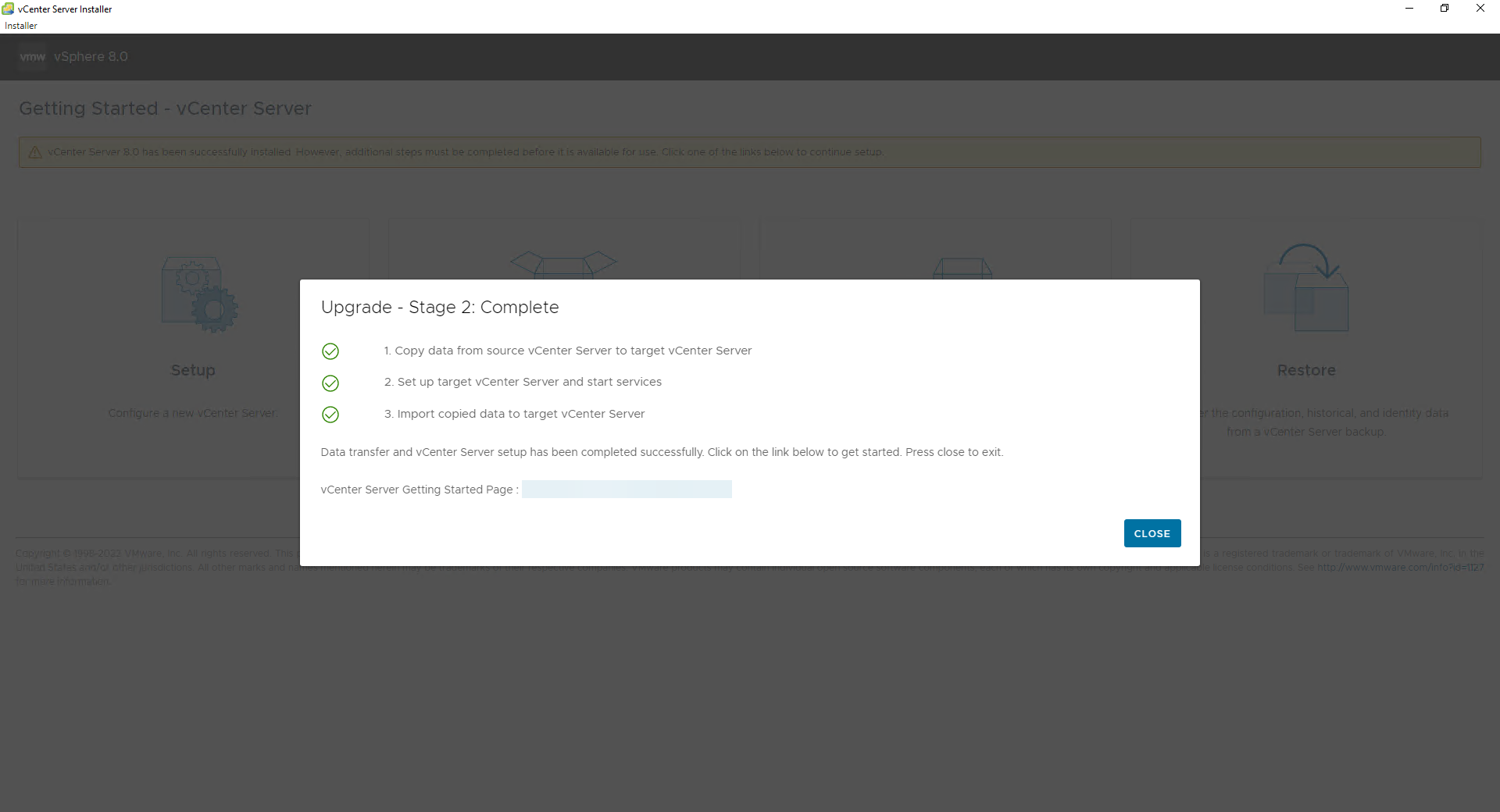 Congratulations! You have completed the upgrade to VMware vCenter Server 8.0! For more information on VMware vSphere 8.0 and the upgrade process, please check out the following links: