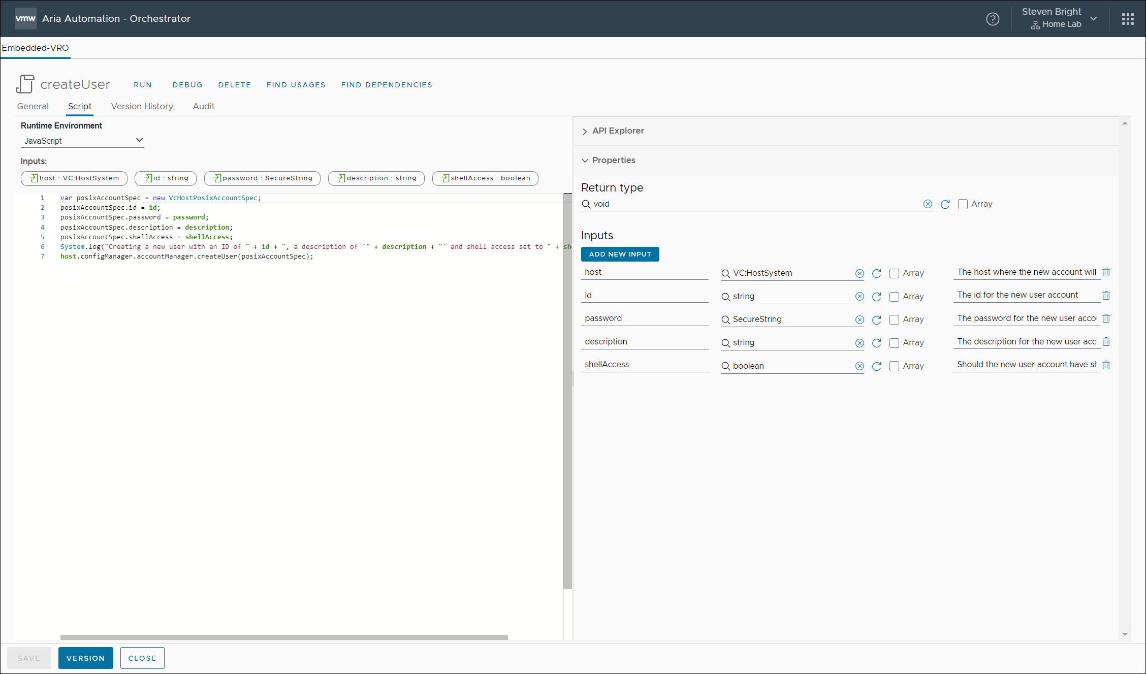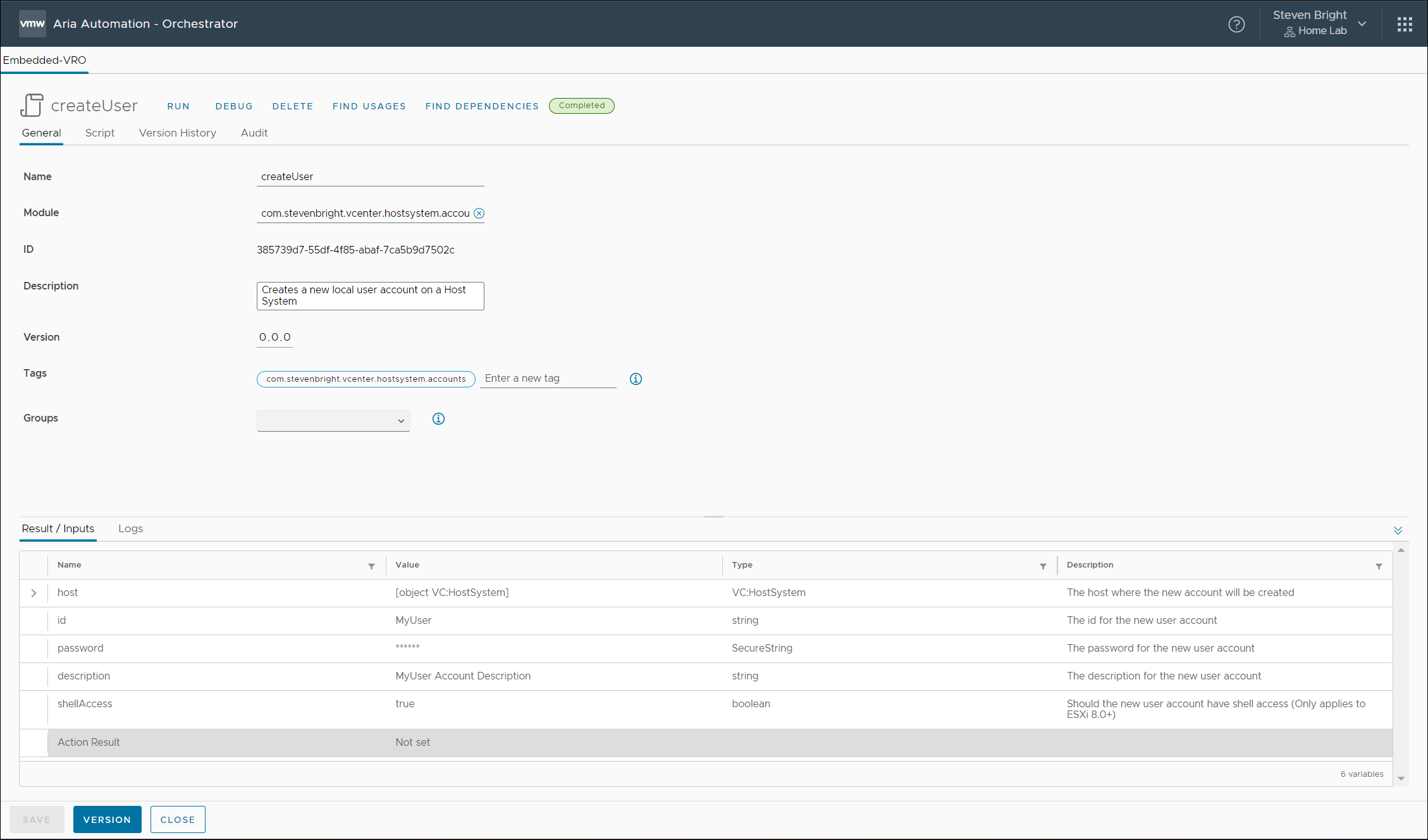 Our next goal is to create a new local user account for a provided VMware ESXi host. To accomplish this, we create a new VMware Aria Automation Orchestrator action called createUser. This new action has five inputs: