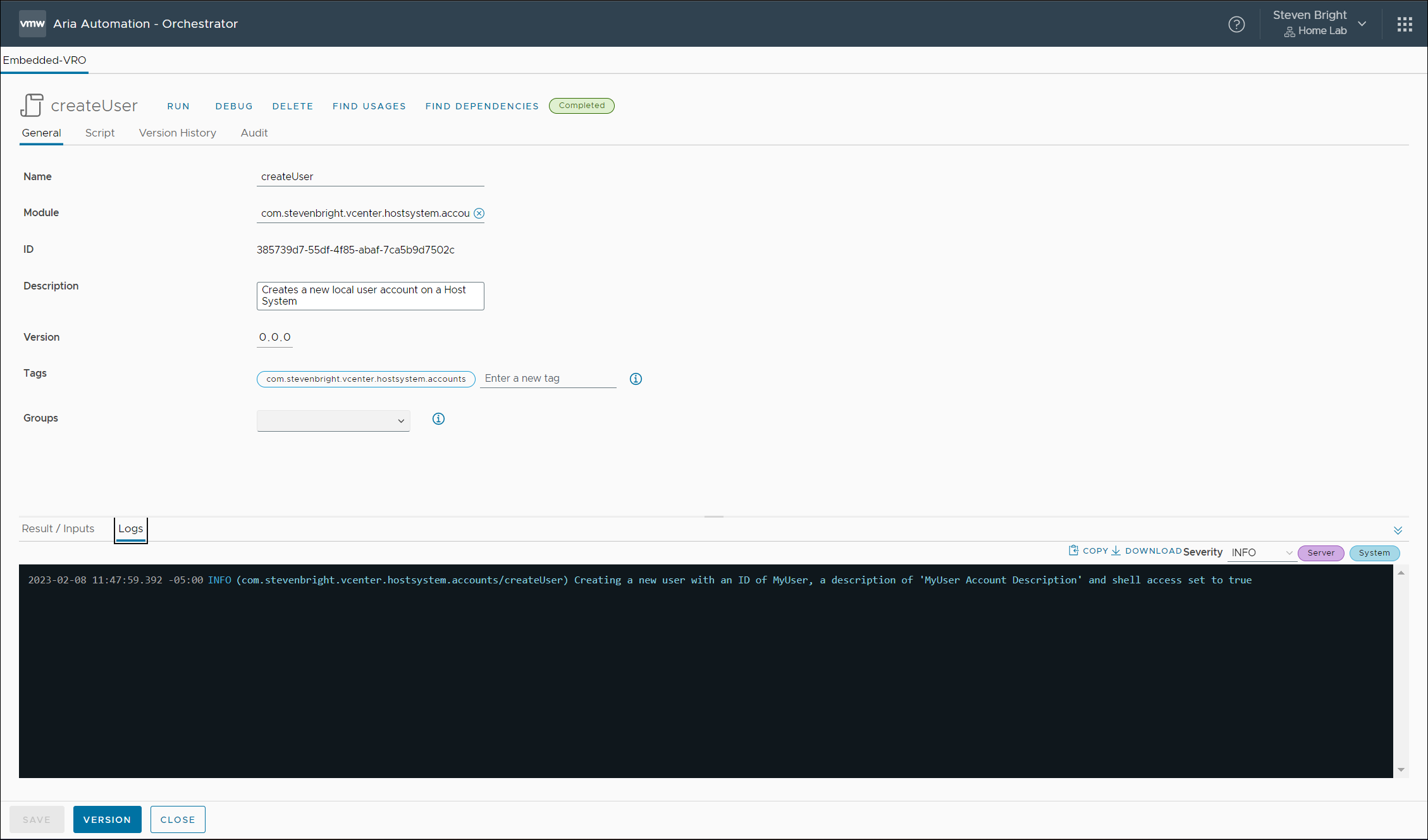 In my previous blog post Managing ESXi Local User Accounts from vCenter Server Using PowerCLI, I provided a quick walkthrough of how to manage ESXi local user accounts using VMware PowerCLI and VMware vCenter Server. This post will provide a similar walkthrough, but I will utilize VMware Aria Automation Orchestrator this time.