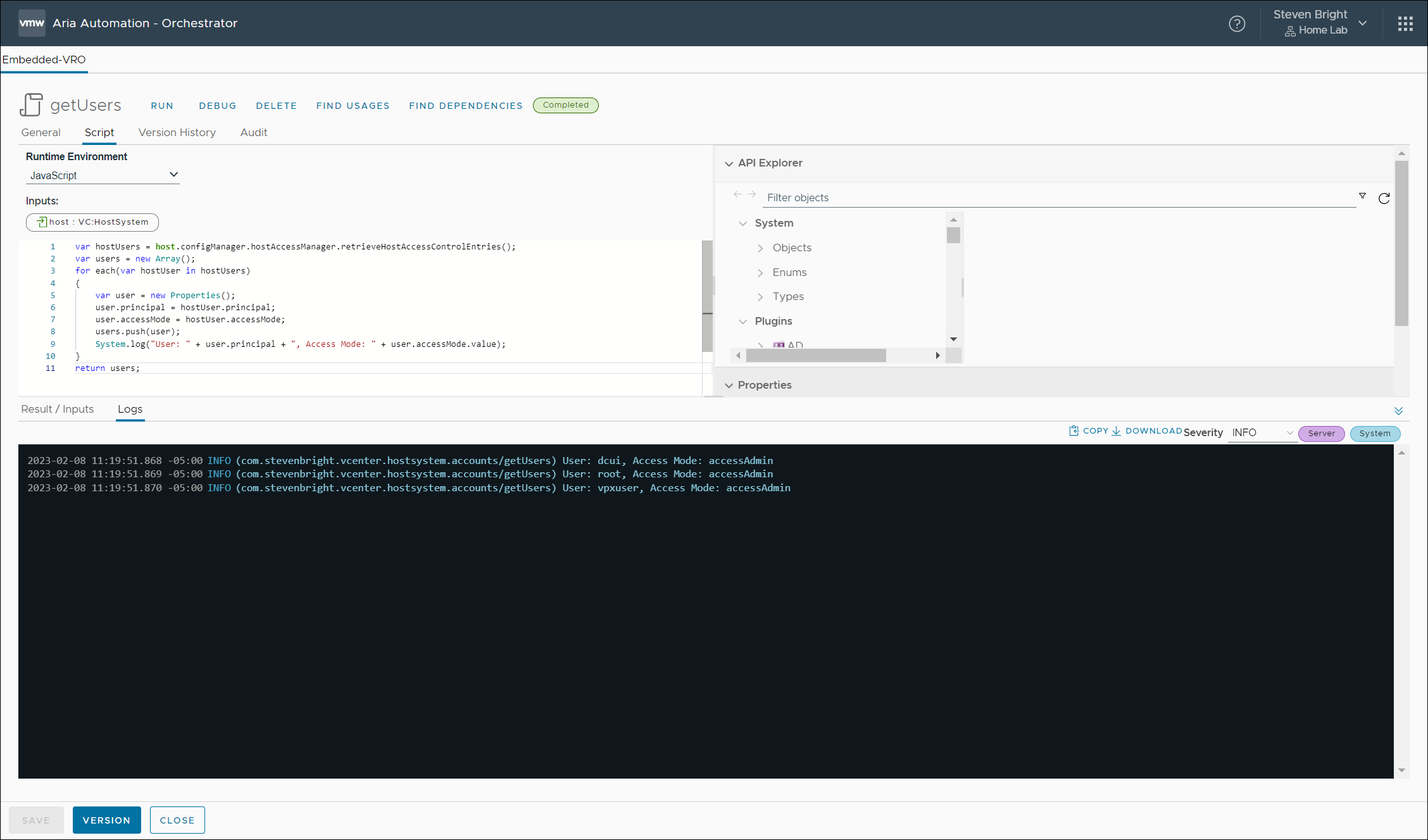The code shown in this post, as well as example workflows can be downloaded as a VMware Aria Automation Orchestrator package from the Downloads page or directly from here: com.stevenbright.vcenter.hostsystem.accounts.zip.