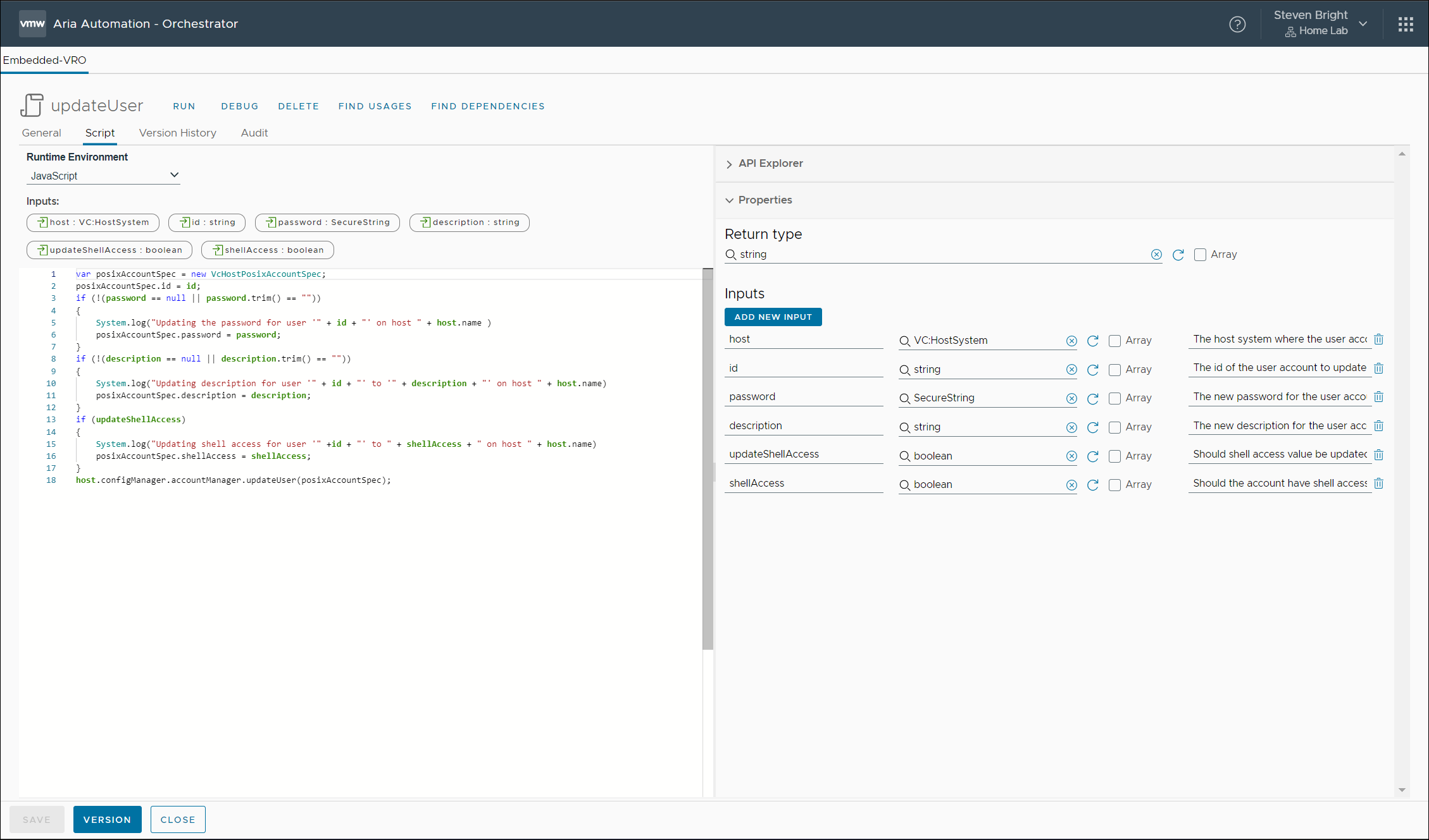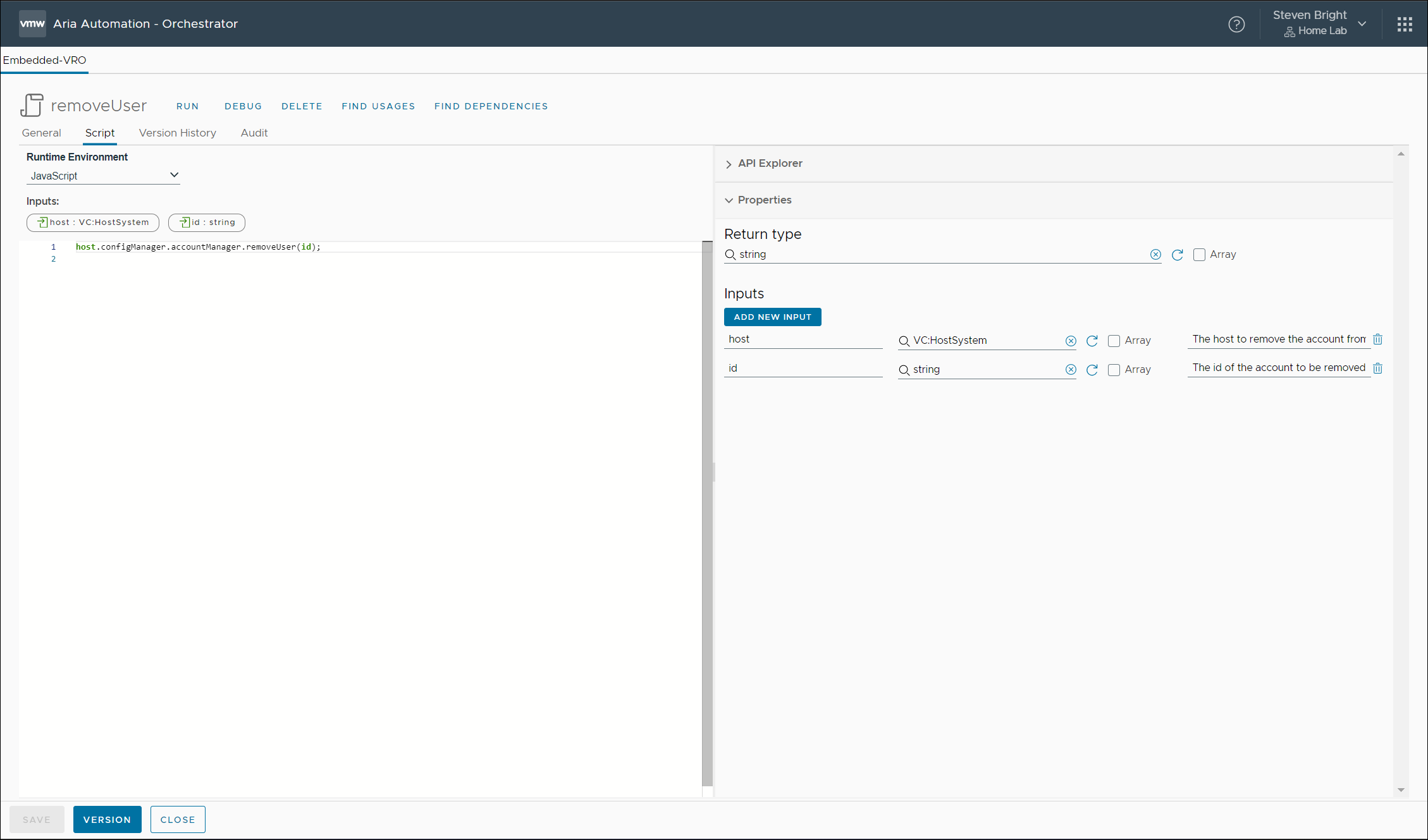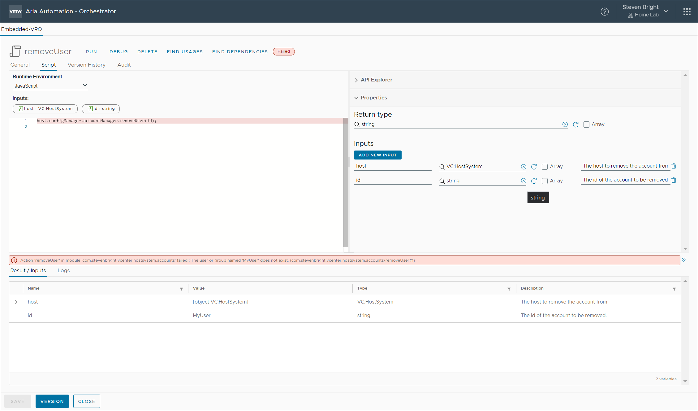 Deleting a local user account from a VMware ESXi host using VMware Aria Automation Orchestrator is easy. The only input required is the host where we’ll delete the user account and the id of the user account to delete. The code for this action consists of a single line: