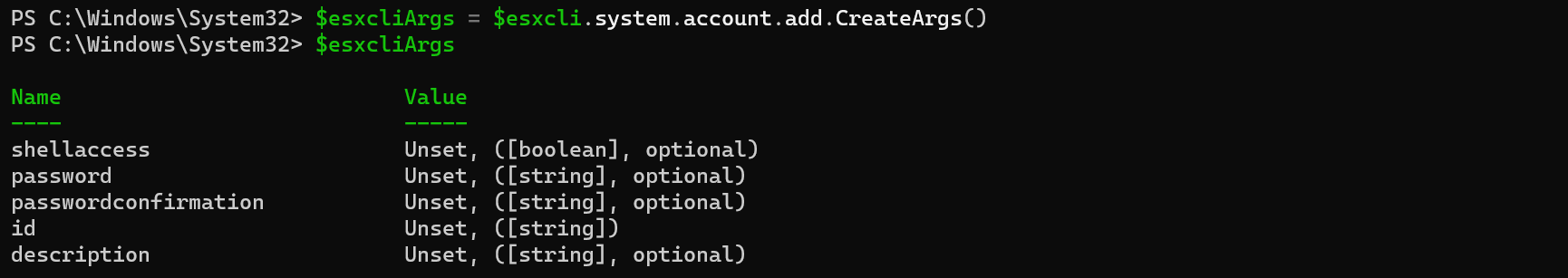 $esxcliArgs = $esxcli.system.account.set.CreateArgs()