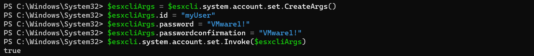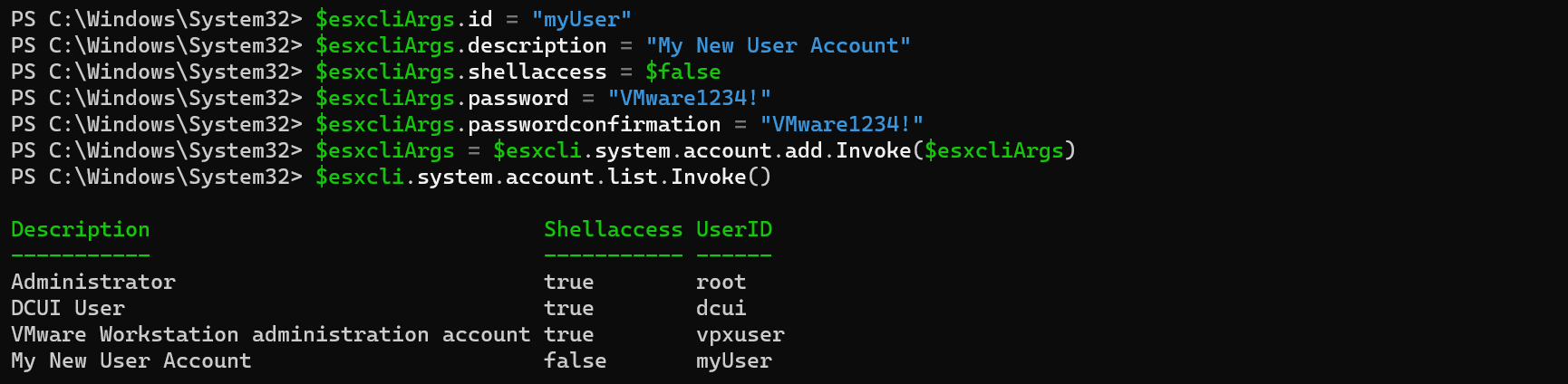 For this example, I create a new user account with the id of myUser, a description of My New User Account, shellAccess set to false, and a password of VMware1234!. This is accomplished by setting the properties on the $esxicliArgs variable that was just created and issuing the esxcli.system.account.add.invoke command as follows: