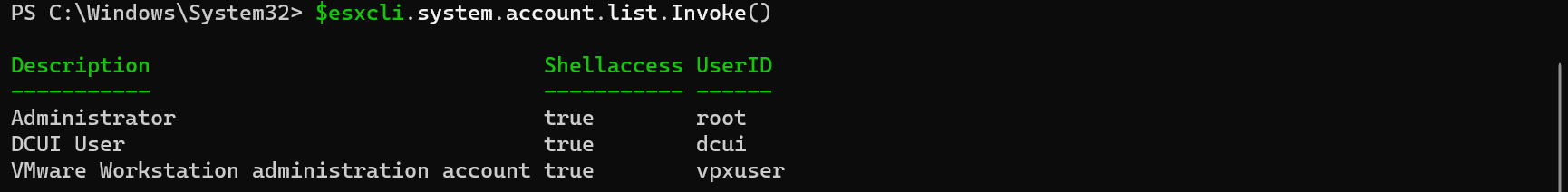 Now that we have an instance of the esxcli command object available to us, we use the following command to list the local user accounts on the VMware ESXi host: