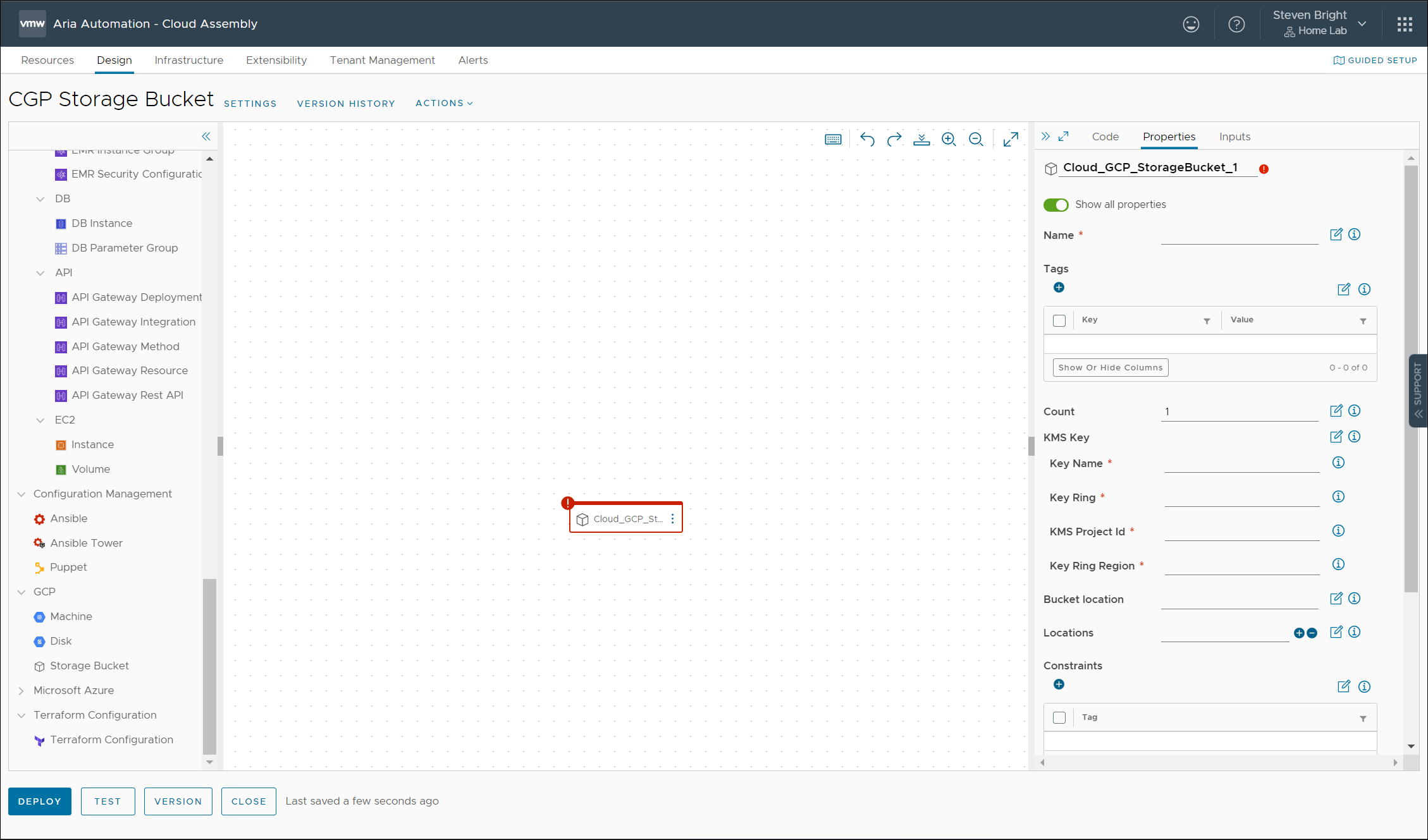 Provision GCP storage bucket resources – Aria Automation now supports GCP storage buckets that allow users to easily create and manage their storage buckets. This includes the creation of multi-regional/dual-regional buckets, restricted public access, and encryption support. Learn more.