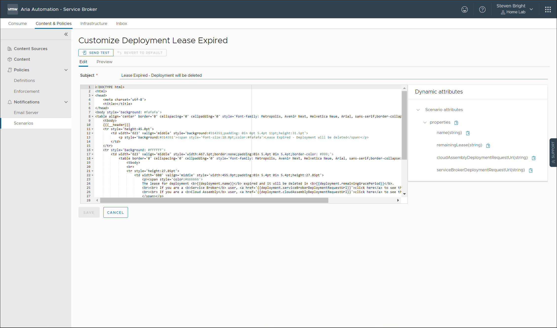 Customized notifications in Service Broker – You can now customize the look and feel of notification emails sent out from VMware Aria Automation Service Broker. The email header and footer can be standardized to your organization’s branding requirements across all notification templates. For each notification scenario, you can now edit the email’s body text and utilize dynamic attributes of deployments in the text. Learn more.