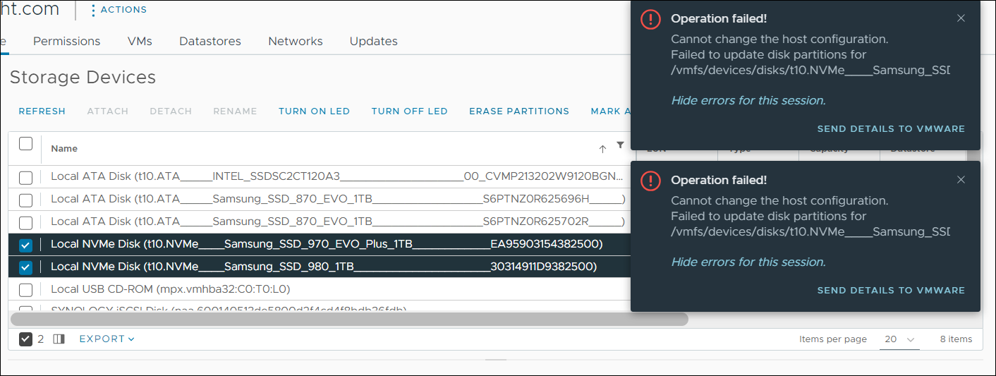 Unable to delete partition 1 from device /vmfs/devices/disks/t10.NVMe____Samsung_SSD_970_EVO_Plus_1TB____________3808430158382500