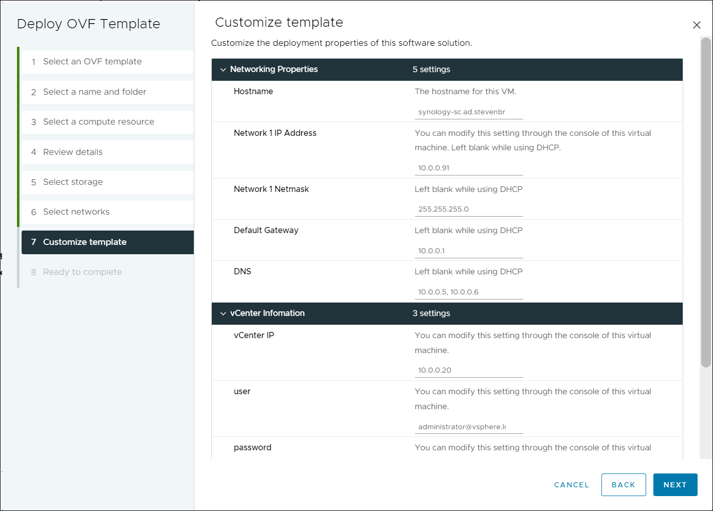 Deployment of the Synology Storage Console is a simple process that involves deploying a small OVA virtual appliance. Deployment of the appliance supports either DHCP or static IPv4 address assignments. Additionally, you must provide your VMware vCenter Server Appliance’s IP address and a username/password with access to the VMware vCenter Server. Synology does not mention what privileges this user account must have in their documentation. Since the account will manage VMware ESXi host storage, I suggest you start with an account with Administrator privileges.