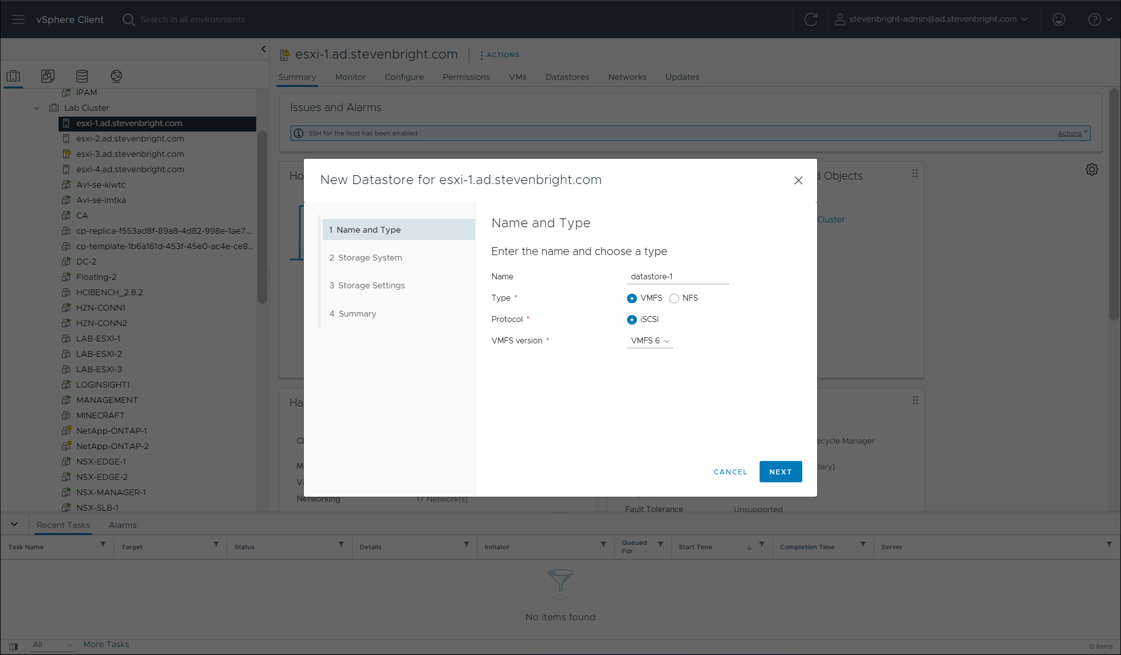 The resulting dialog box presented will walk you through creating the new datastore. On the wizard’s first screen, provide a Name for the new datastore and select if the datastore will be VMFS or NFS. If you choose VMFS , you are presented with a protocol selection (unless your Synology storage system supports fiber-channel, the only option will be iSCSI). You also are provided an opportunity to pick the VMFS version. If you select NFS, you are presented with the option to choose the NFS version. Click the NEXT button to continue to the next step in the process.